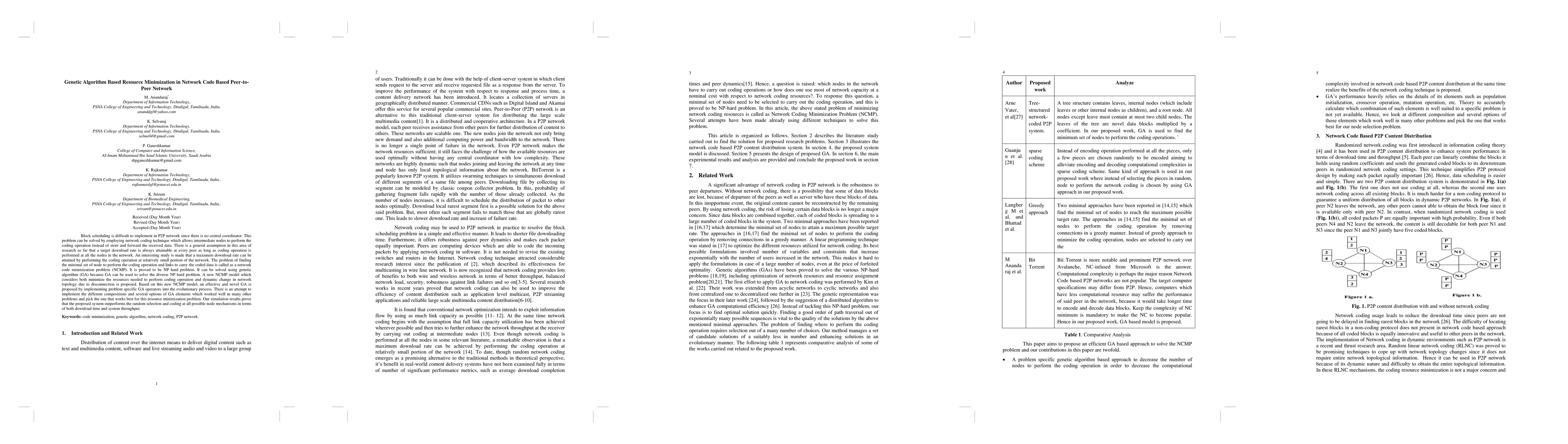 Block scheduling is difficult to implement in P2P network since there is no central coordinator. This problem can be solved by employing network coding technique which allows intermediate nodes to perform the coding operation instead of conventional store and forward the received data. There is a general assumption in this area of research so far that a target download rate is always attainable at every peer as long as coding operation is performed at all the nodes in the network. An interesting study is made that a maximum download rate can be attained by performing the coding operation at relatively small portion of the network. The problem of finding the minimal set of node to perform the coding operation and links to carry the coded data is called as a network code minimization problem (NCMP). It is proved to be NP hard problem. It can be solved using genetic algorithm (GA) because GA can be used to solve the diverse NP hard problem. A new NCMP model is proposed which considers both minimize the resources needed to perform coding operation and dynamic change in network topology due to disconnection. Based on this new NCMP model, an effective and novel GA is proposed by implementing problem specific GA operators into the evolutionary process. There is an attempt to implement the different compositions and several options of GA elements which worked well in many other problems and pick the one that works best for this resource minimization problem. Our simulation results prove that the proposed system outperforms the random selection and coding at all possible node mechanisms in terms of both download time and system throughput.