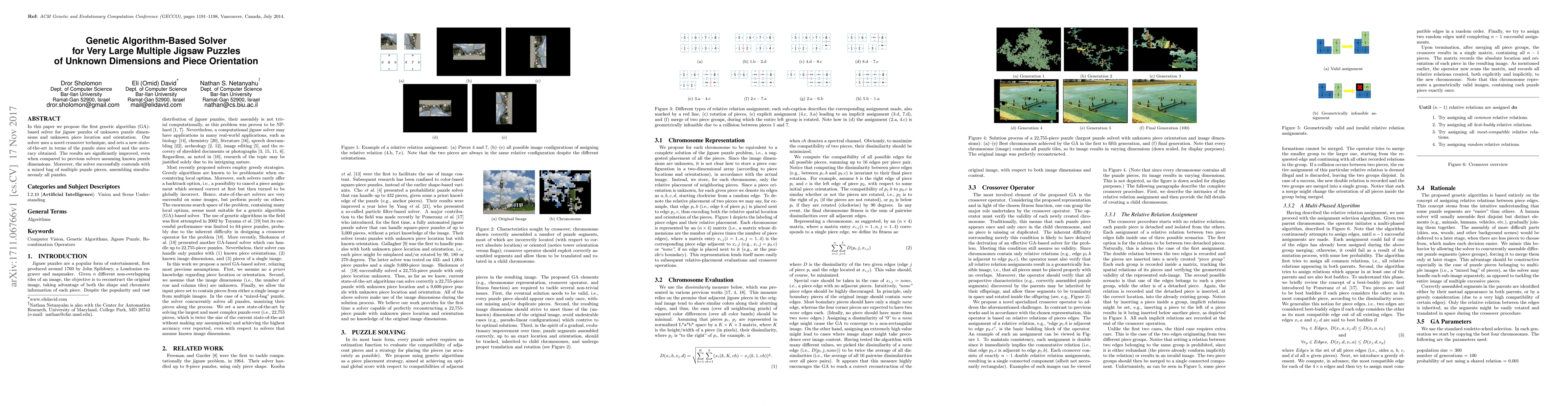 A genetic algorithm-based solver has been developed to solve large jigsaw puzzles of unknown dimensions and piece orientation, achieving state-of-the-art results in puzzle sizes and accuracy, and successfully solving mixed bag puzzles with simultaneous assembly.
