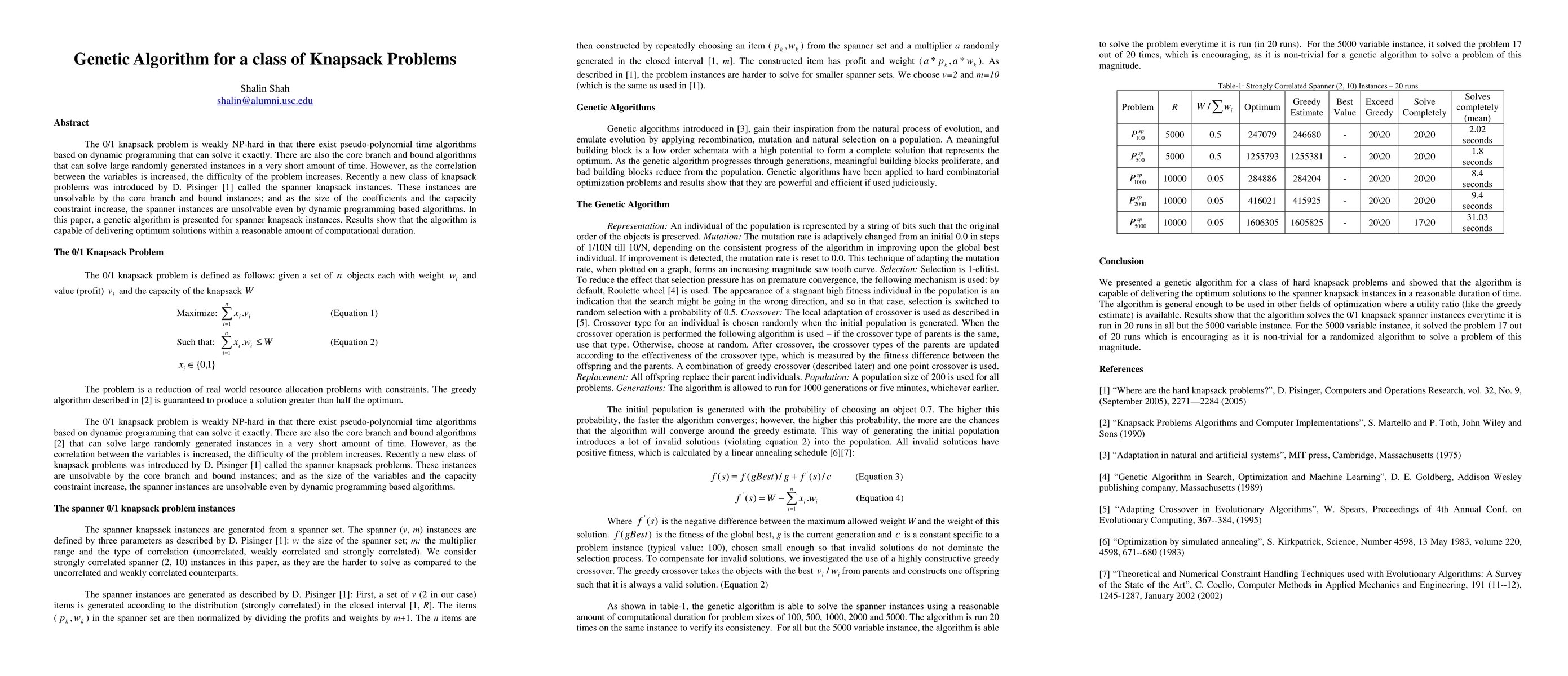This paper proposes a genetic algorithm to tackle spanner knapsack problems, which are infeasible for traditional dynamic programming and branch and bound methods due to increased complexity. The genetic algorithm successfully finds optimal solutions within a reasonable timeframe.