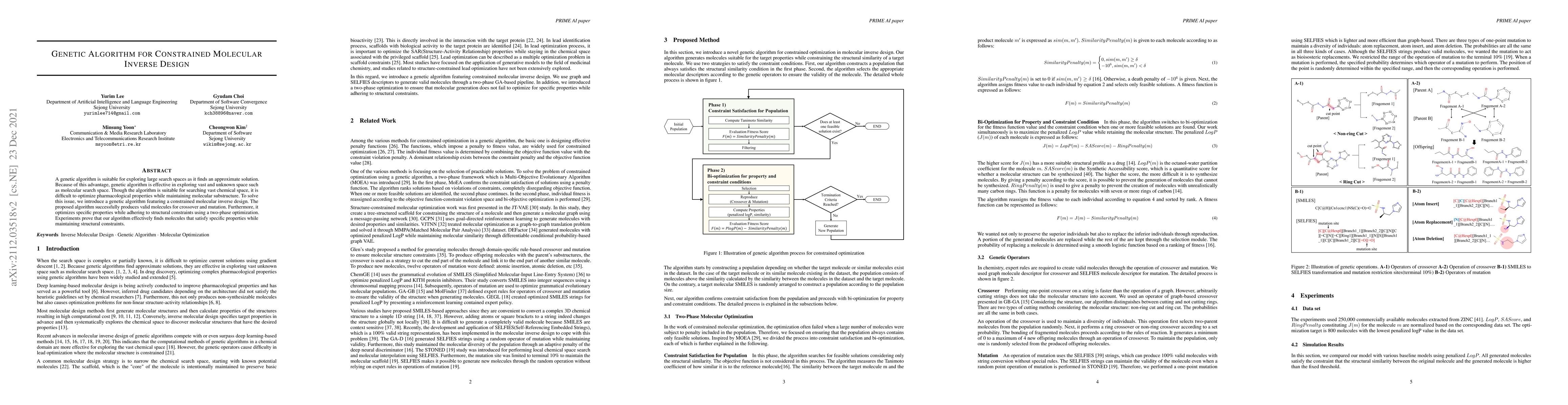 The paper proposes a genetic algorithm for constrained molecular inverse design to explore large chemical spaces and optimize pharmacological properties while maintaining molecular substructure. The algorithm employs a two-phase optimization to successfully generate valid molecules and adhere to structural constraints, as demonstrated by effective experimental results.