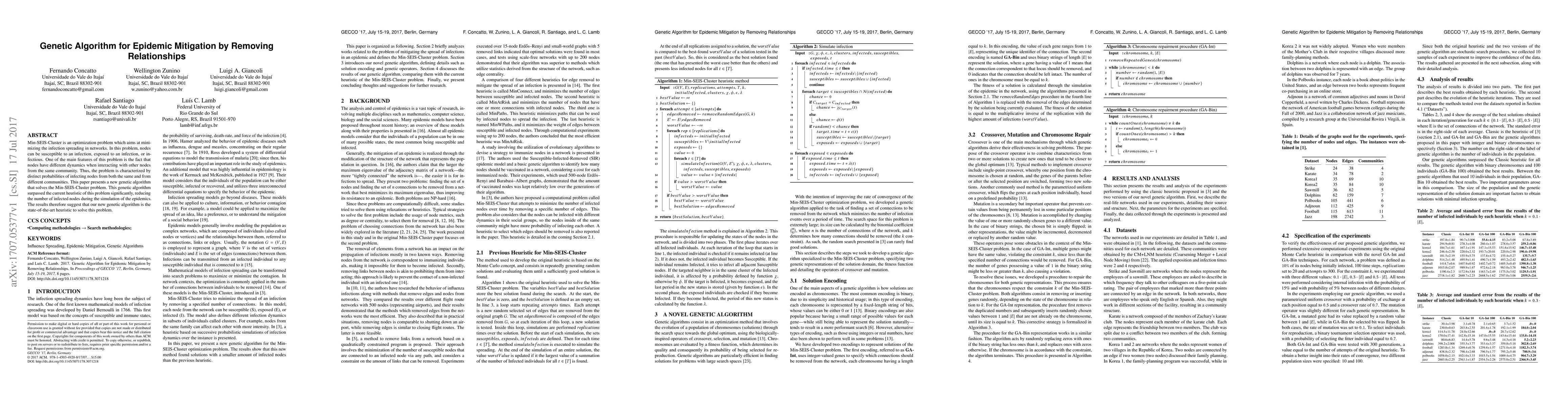 Min-SEIS-Cluster is an optimization problem which aims at minimizing the infection spreading in networks. In this problem, nodes can be susceptible to an infection, exposed to an infection, or infectious. One of the main features of this problem is the fact that nodes have different dynamics when interacting with other nodes from the same community. Thus, the problem is characterized by distinct probabilities of infecting nodes from both the same and from different communities. This paper presents a new genetic algorithm that solves the Min-SEIS-Cluster problem. This genetic algorithm surpassed the current heuristic of this problem significantly, reducing the number of infected nodes during the simulation of the epidemics. The results therefore suggest that our new genetic algorithm is the state-of-the-art heuristic to solve this problem.