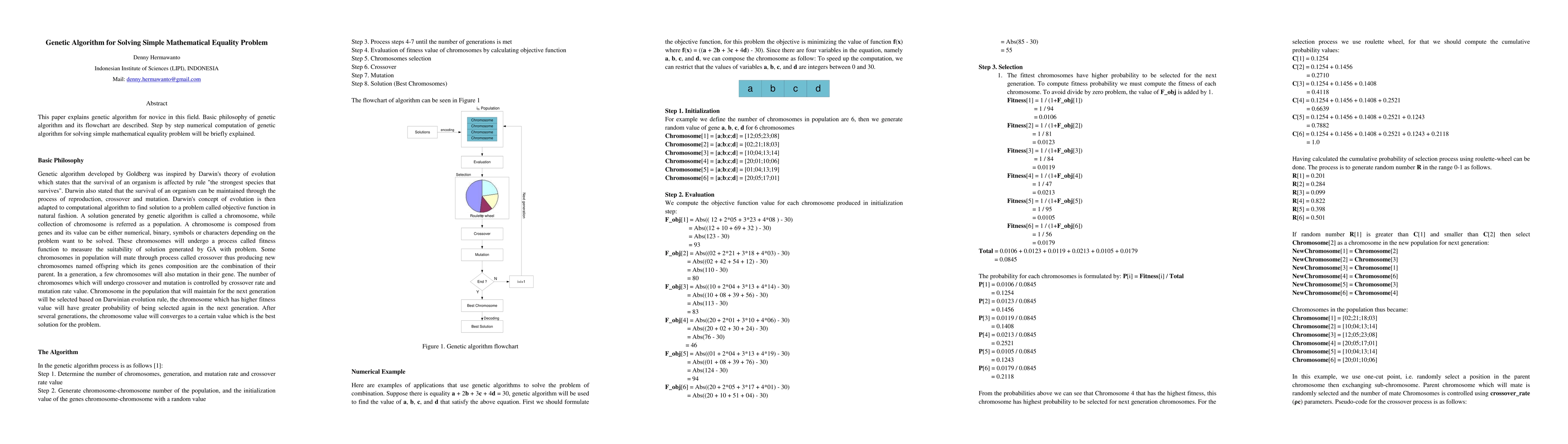This paper introduces genetic algorithms to beginners, detailing their basic principles and flowchart. It provides a step-by-step numerical example to demonstrate solving a simple mathematical equality problem using genetic algorithms.