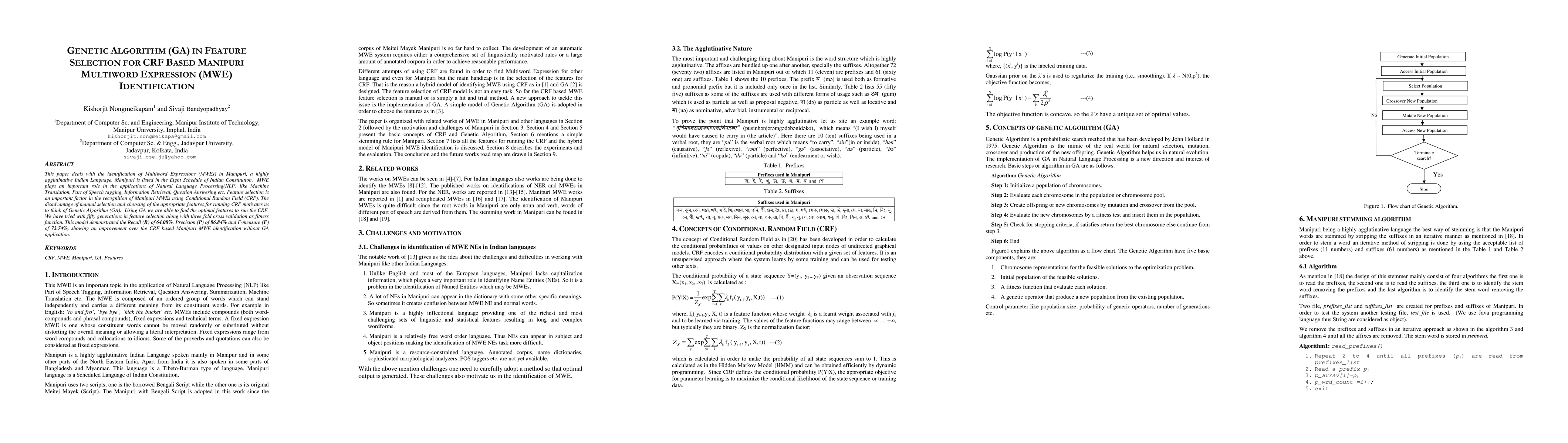 This paper explores the use of Genetic Algorithm (GA) for feature selection in Conditional Random Field (CRF) based Manipuri Multiword Expression (MWE) identification, achieving a Recall of 64.08%, Precision of 86.84%, and F-measure of 73.74%, outperforming traditional CRF methods.