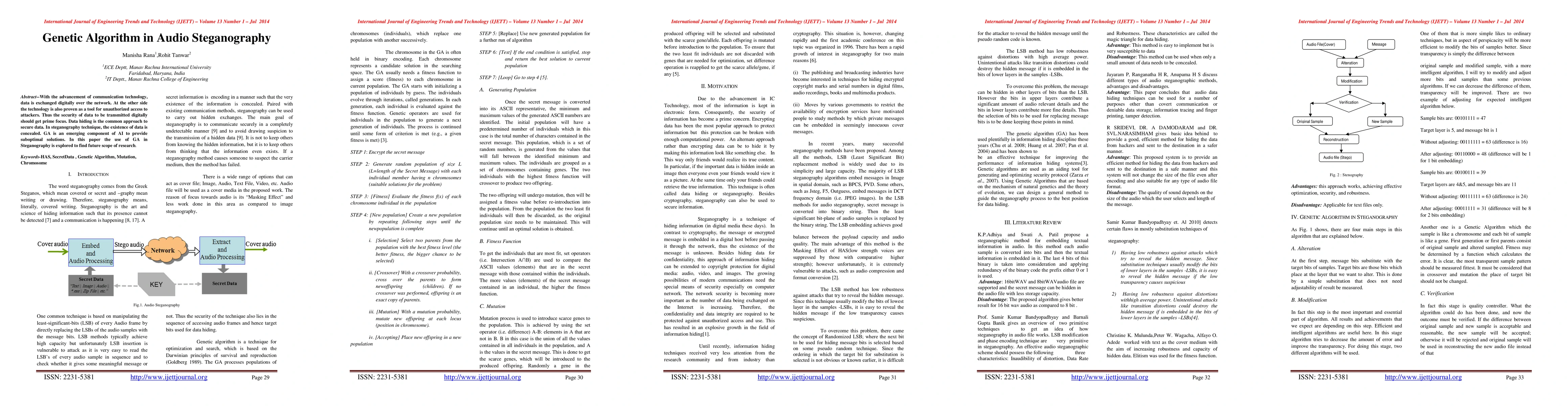This paper explores the use of a genetic algorithm in audio steganography to securely hide data within digital audio files. It aims to provide a future direction for research on this emerging technique.
