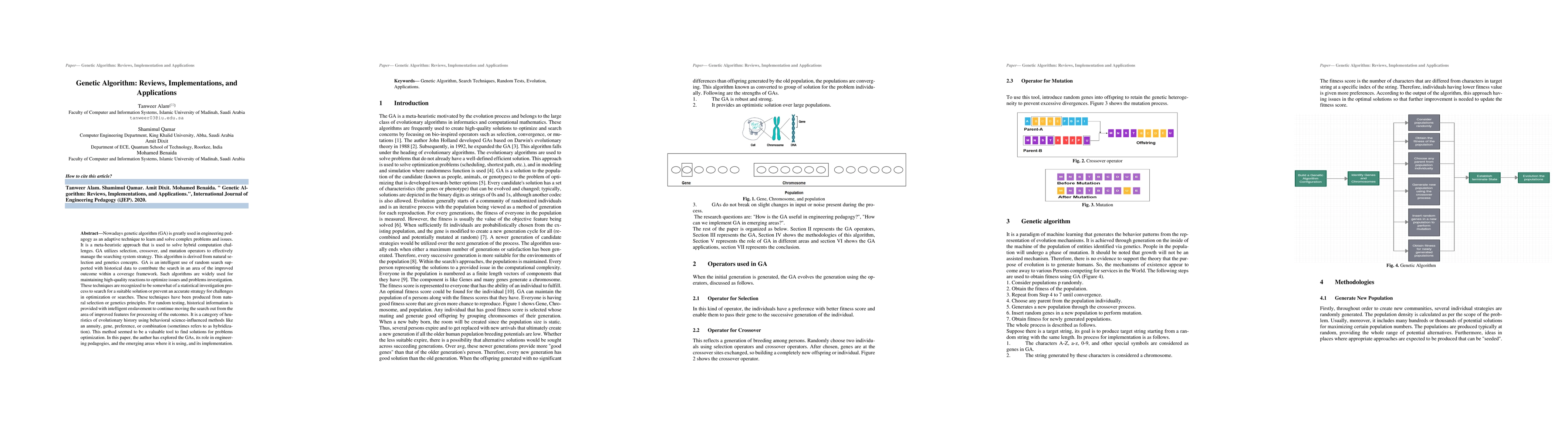 Nowadays genetic algorithm (GA) is greatly used in engineering pedagogy as an adaptive technique to learn and solve complex problems and issues. It is a meta-heuristic approach that is used to solve hybrid computation challenges. GA utilizes selection, crossover, and mutation operators to effectively manage the searching system strategy. This algorithm is derived from natural selection and genetics concepts. GA is an intelligent use of random search supported with historical data to contribute the search in an area of the improved outcome within a coverage framework. Such algorithms are widely used for maintaining high-quality reactions to optimize issues and problems investigation. These techniques are recognized to be somewhat of a statistical investigation process to search for a suitable solution or prevent an accurate strategy for challenges in optimization or searches. These techniques have been produced from natural selection or genetics principles. For random testing, historical information is provided with intelligent enslavement to continue moving the search out from the area of improved features for processing of the outcomes. It is a category of heuristics of evolutionary history using behavioral science-influenced methods like an annuity, gene, preference, or combination (sometimes refers to as hybridization). This method seemed to be a valuable tool to find solutions for problems optimization. In this paper, the author has explored the GAs, its role in engineering pedagogies, and the emerging areas where it is using, and its implementation.