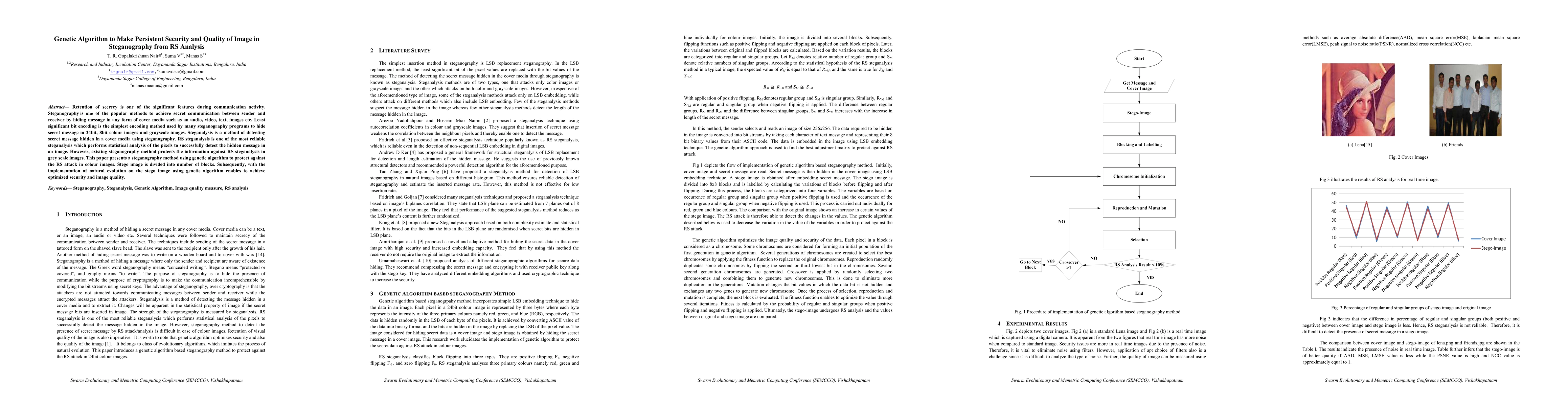 This paper proposes a steganography method using genetic algorithms to enhance security and image quality against RS steganalysis, particularly for color images, by optimizing the stego image through natural evolution.