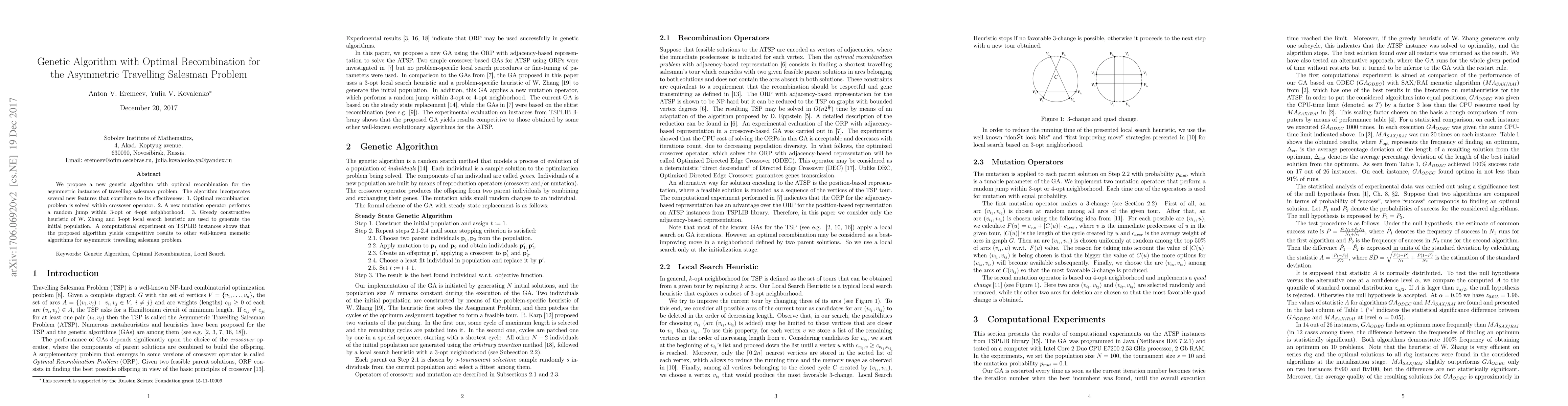This paper introduces a novel genetic algorithm with optimal recombination for solving asymmetric travelling salesman problems. The algorithm features an integrated optimal recombination within the crossover operator, a new mutation operator, and initial population generation using heuristics, achieving competitive results against other memetic algorithms.