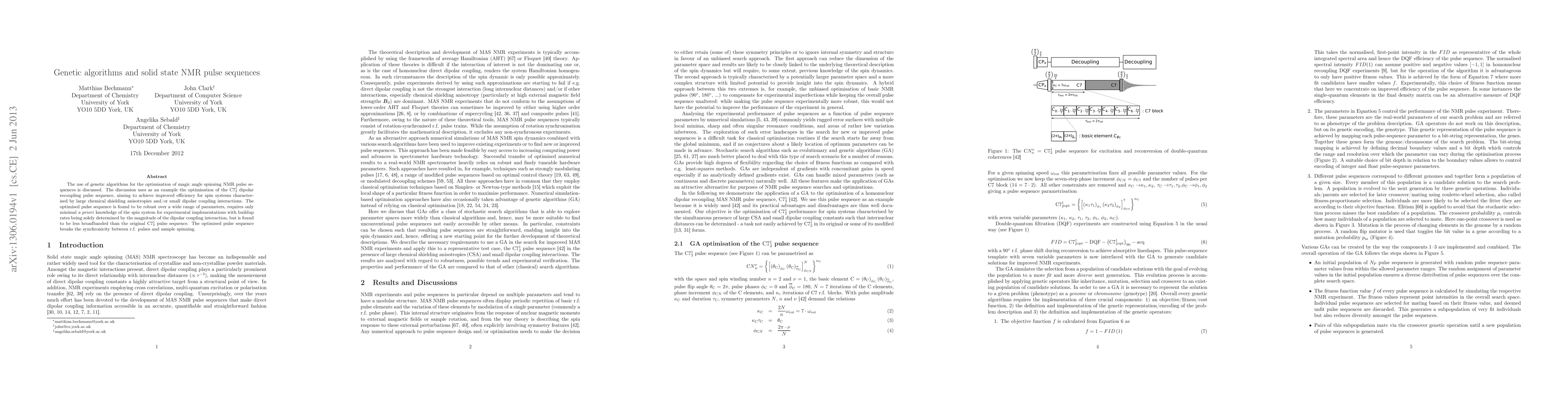 The use of genetic algorithms for the optimisation of magic angle spinning NMR pulse sequences is discussed. The discussion uses as an example the optimisation of the C7 dipolar recoupling pulse sequence, aiming to achieve improved efficiency for spin systems characterised by large chemical shielding anisotropies and/or small dipolar coupling interactions. The optimised pulse sequence is found to be robust over a wide range of parameters, requires only minimal a priori knowledge of the spin system for experimental implementations with buildup rates being solely determined by the magnitude of the dipolar coupling interaction, but is found to be less broadbanded than the original C7 pulse sequence. The optimised pulse sequence breaks the synchronicity between r.f. pulses and sample spinning.