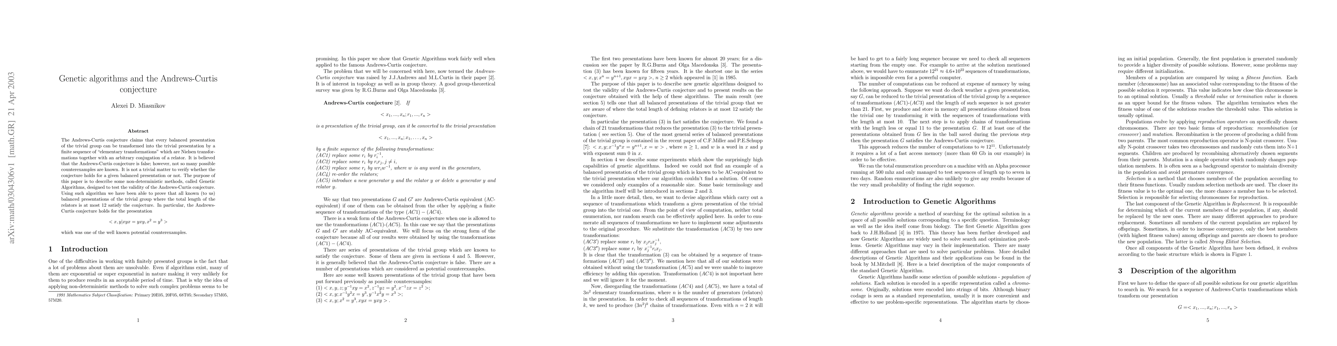 Researchers used Genetic Algorithms to test the Andrews-Curtis conjecture for balanced presentations of the trivial group with relators up to 12 characters long, successfully proving its validity for many known counterexamples.
