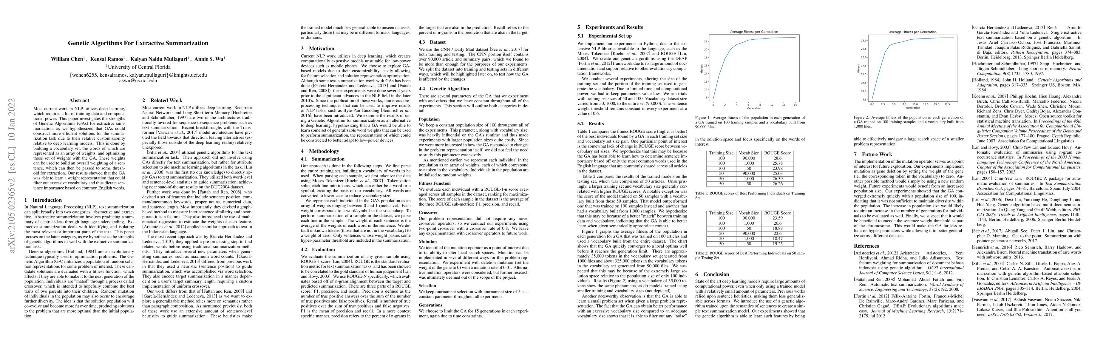 The results showed that a weight representation learned by the GA could effectively reduce noise in text data, making it suitable for summarization tasks.
