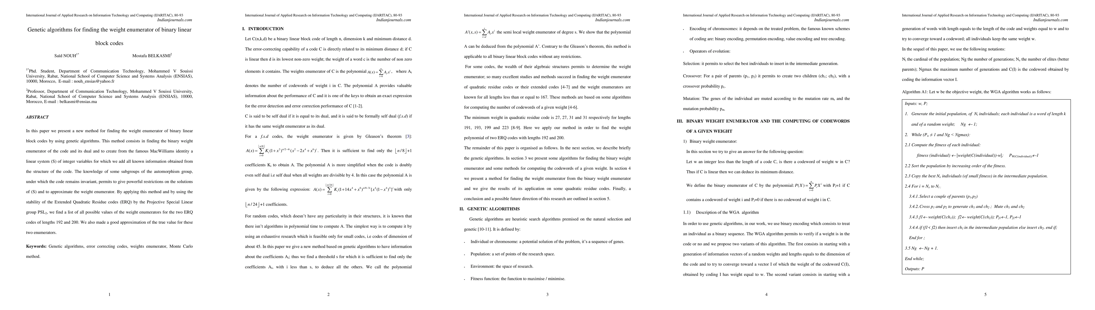 This paper introduces a genetic algorithm approach to determine the weight enumerator of binary linear block codes, leveraging MacWilliams identity and subgroup automorphisms to constrain solutions and identify possible values for the Extended Quadratic Residue codes of lengths 192 and 200, approximating their true weight enumerators.