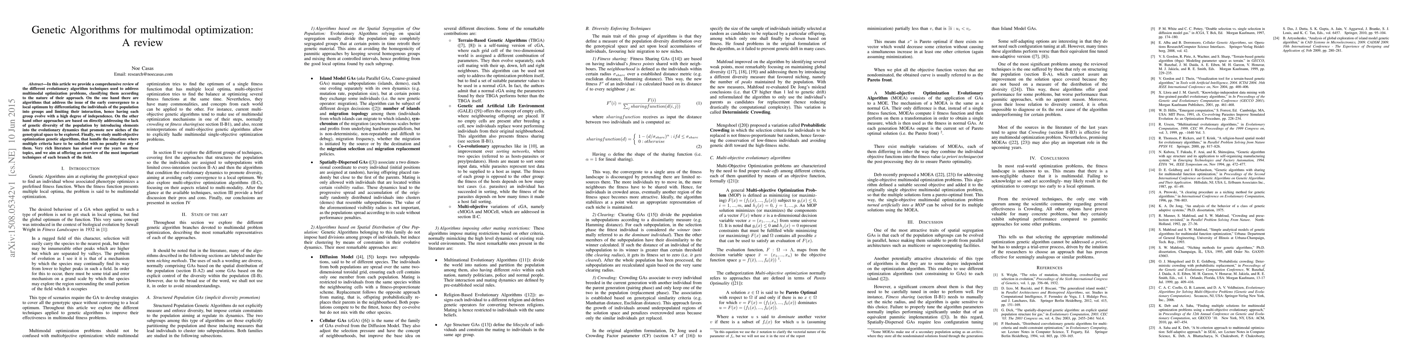This paper reviews evolutionary algorithms for multimodal optimization, categorizing techniques that prevent early convergence to local optima through population segmentation and those that enhance genetic diversity by promoting exploration of new niches. It also covers multi-objective optimization genetic algorithms. The review aims to provide an overview of the most significant methods in each area.