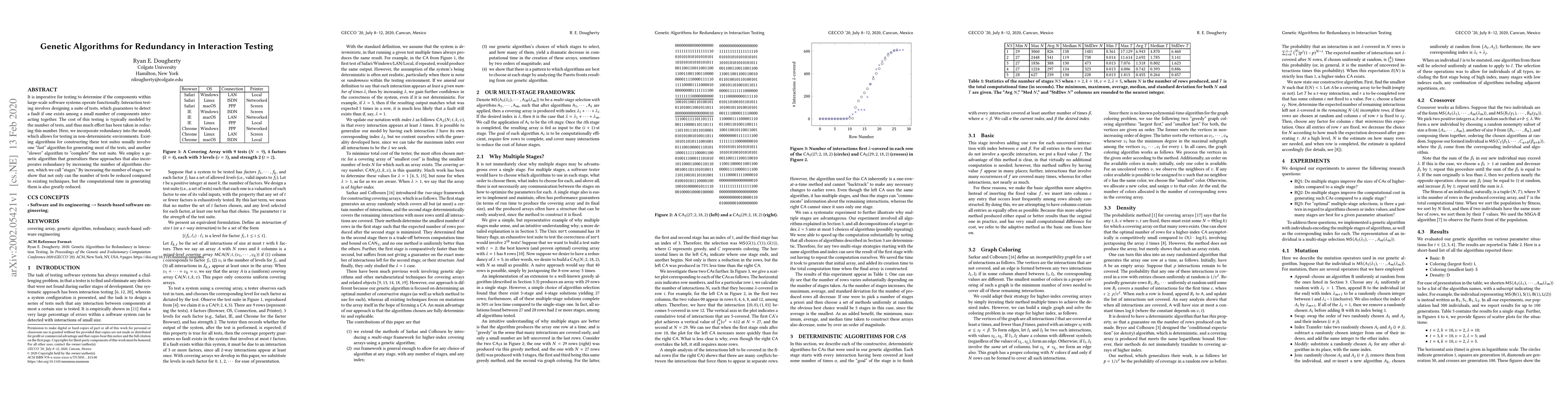 A genetic algorithm is used to optimize interaction testing in software systems, reducing both test number and computational time by incorporating redundancy and increasing the number of algorithms chosen.