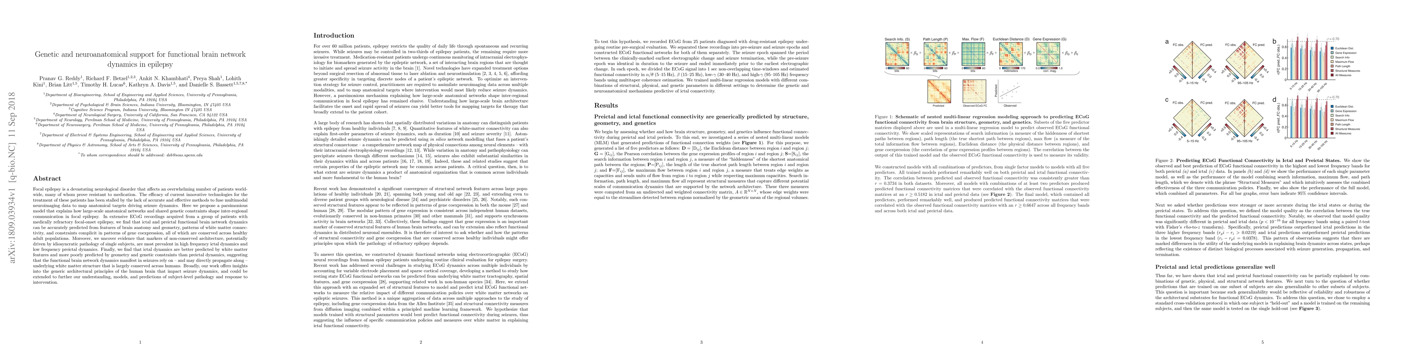Focal epilepsy is a devastating neurological disorder that affects an overwhelming number of patients worldwide, many of whom prove resistant to medication. The efficacy of current innovative technologies for the treatment of these patients has been stalled by the lack of accurate and effective methods to fuse multimodal neuroimaging data to map anatomical targets driving seizure dynamics. Here we propose a parsimonious model that explains how large-scale anatomical networks and shared genetic constraints shape inter-regional communication in focal epilepsy. In extensive ECoG recordings acquired from a group of patients with medically refractory focal-onset epilepsy, we find that ictal and preictal functional brain network dynamics can be accurately predicted from features of brain anatomy and geometry, patterns of white matter connectivity, and constraints complicit in patterns of gene coexpression, all of which are conserved across healthy adult populations. Moreover, we uncover evidence that markers of non-conserved architecture, potentially driven by idiosyncratic pathology of single subjects, are most prevalent in high frequency ictal dynamics and low frequency preictal dynamics. Finally, we find that ictal dynamics are better predicted by white matter features and more poorly predicted by geometry and genetic constraints than preictal dynamics, suggesting that the functional brain network dynamics manifest in seizures rely on - and may directly propagate along - underlying white matter structure that is largely conserved across humans. Broadly, our work offers insights into the generic architectural principles of the human brain that impact seizure dynamics, and could be extended to further our understanding, models, and predictions of subject-level pathology and response to intervention.