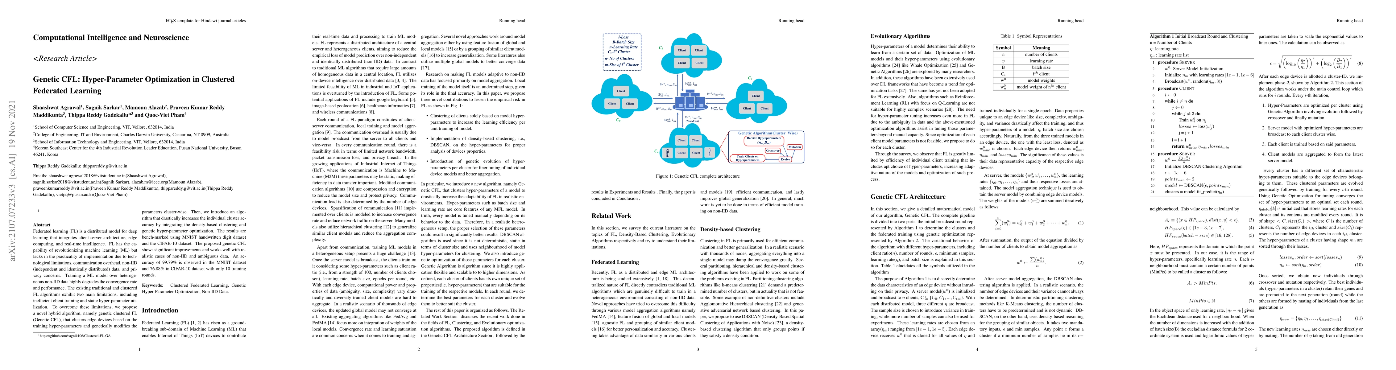 Federated learning (FL) is a distributed model for deep learning that integrates client-server architecture, edge computing, and real-time intelligence. FL has the capability of revolutionizing machine learning (ML) but lacks in the practicality of implementation due to technological limitations, communication overhead, non-IID (independent and identically distributed) data, and privacy concerns. Training a ML model over heterogeneous non-IID data highly degrades the convergence rate and performance. The existing traditional and clustered FL algorithms exhibit two main limitations, including inefficient client training and static hyper-parameter utilization. To overcome these limitations, we propose a novel hybrid algorithm, namely genetic clustered FL (Genetic CFL), that clusters edge devices based on the training hyper-parameters and genetically modifies the parameters cluster-wise. Then, we introduce an algorithm that drastically increases the individual cluster accuracy by integrating the density-based clustering and genetic hyper-parameter optimization. The results are bench-marked using MNIST handwritten digit dataset and the CIFAR-10 dataset. The proposed genetic CFL shows significant improvements and works well with realistic cases of non-IID and ambiguous data.