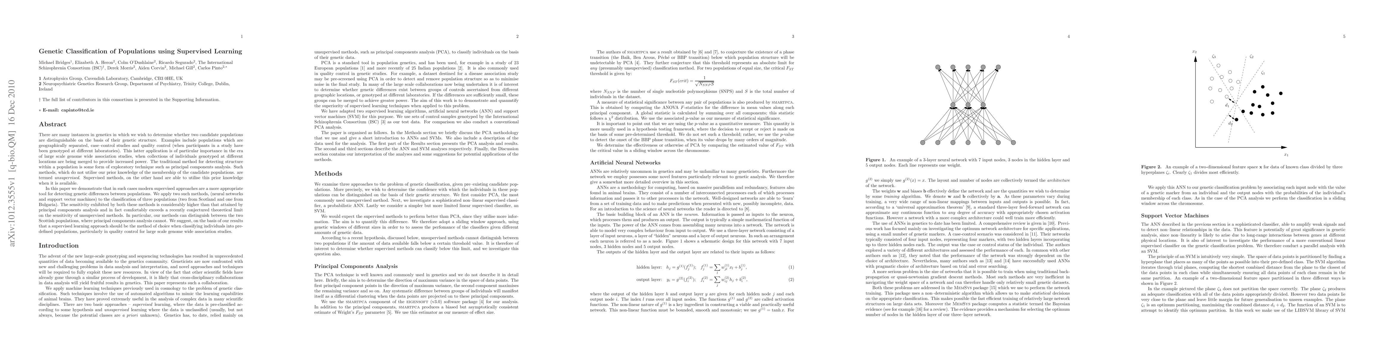 There are many instances in genetics in which we wish to determine whether two candidate populations are distinguishable on the basis of their genetic structure. Examples include populations which are geographically separated, case--control studies and quality control (when participants in a study have been genotyped at different laboratories). This latter application is of particular importance in the era of large scale genome wide association studies, when collections of individuals genotyped at different locations are being merged to provide increased power. The traditional method for detecting structure within a population is some form of exploratory technique such as principal components analysis. Such methods, which do not utilise our prior knowledge of the membership of the candidate populations. are termed \emph{unsupervised}. Supervised methods, on the other hand are able to utilise this prior knowledge when it is available. In this paper we demonstrate that in such cases modern supervised approaches are a more appropriate tool for detecting genetic differences between populations. We apply two such methods, (neural networks and support vector machines) to the classification of three populations (two from Scotland and one from Bulgaria). The sensitivity exhibited by both these methods is considerably higher than that attained by principal components analysis and in fact comfortably exceeds a recently conjectured theoretical limit on the sensitivity of unsupervised methods. In particular, our methods can distinguish between the two Scottish populations, where principal components analysis cannot. We suggest, on the basis of our results that a supervised learning approach should be the method of choice when classifying individuals into pre-defined populations, particularly in quality control for large scale genome wide association studies.