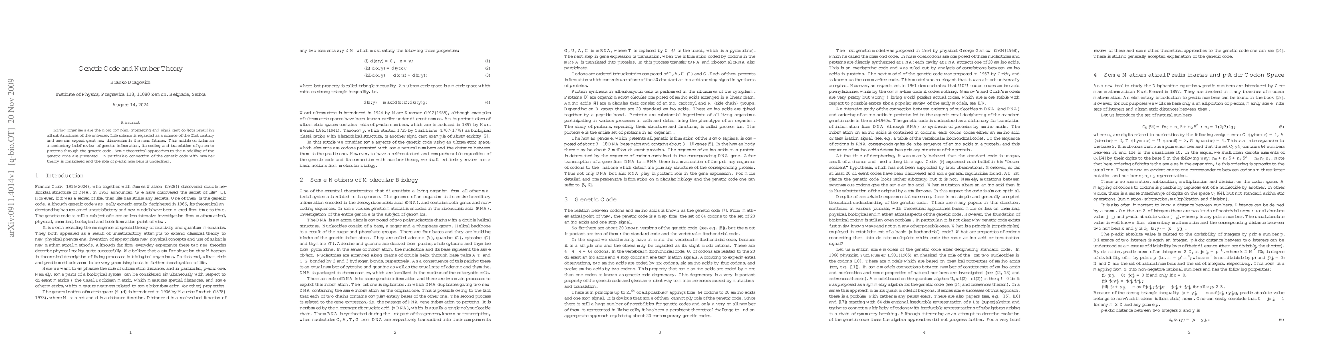 This paper reviews genetic information and the genetic code, emphasizing its translation of genes to proteins. It explores theoretical models linking the genetic code with number theory, highlighting the role of $p$-adic numbers in this connection.
