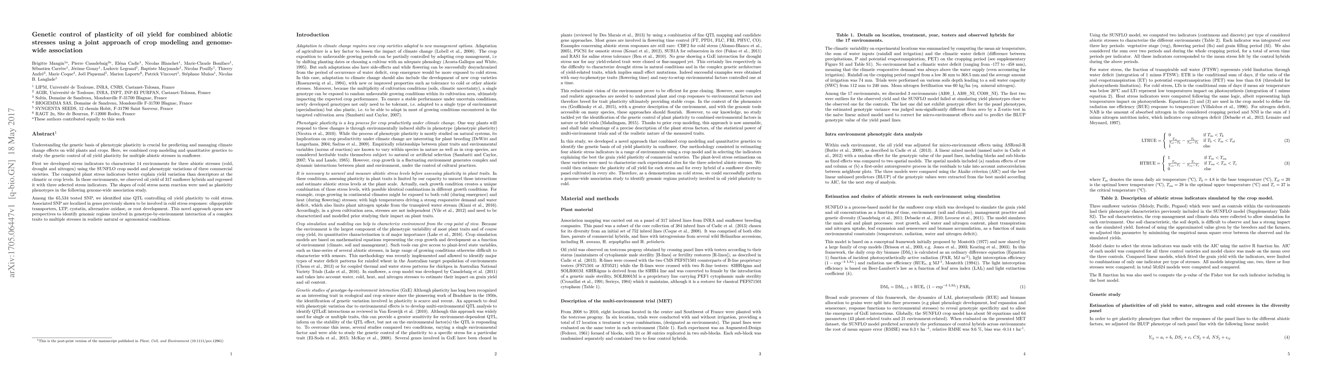 Understanding the genetic basis of phenotypic plasticity is crucial for predicting and managing climate change effects on wild plants and crops. Here, we combined crop modeling and quantitative genetics to study the genetic control of oil yield plasticity for multiple abiotic stresses in sunflower. First we developed stress indicators to characterize 14 environments for three abiotic stresses (cold, drought and nitrogen) using the SUNFLO crop model and phenotypic variations of three commercial varieties. The computed plant stress indicators better explain yield variation than descriptors at the climatic or crop levels. In those environments, we observed oil yield of 317 sunflower hybrids and regressed it with three selected stress indicators. The slopes of cold stress norm reaction were used as plasticity phenotypes in the following genome-wide association study. Among the 65,534 tested SNP, we identified nine QTL controlling oil yield plasticity to cold stress. Associated SNP are localized in genes previously shown to be involved in cold stress responses: oligopeptide transporters, LTP, cystatin, alternative oxidase, or root development. This novel approach opens new perspectives to identify genomic regions involved in genotype-by-environment interaction of a complex traits to multiple stresses in realistic natural or agronomical conditions.