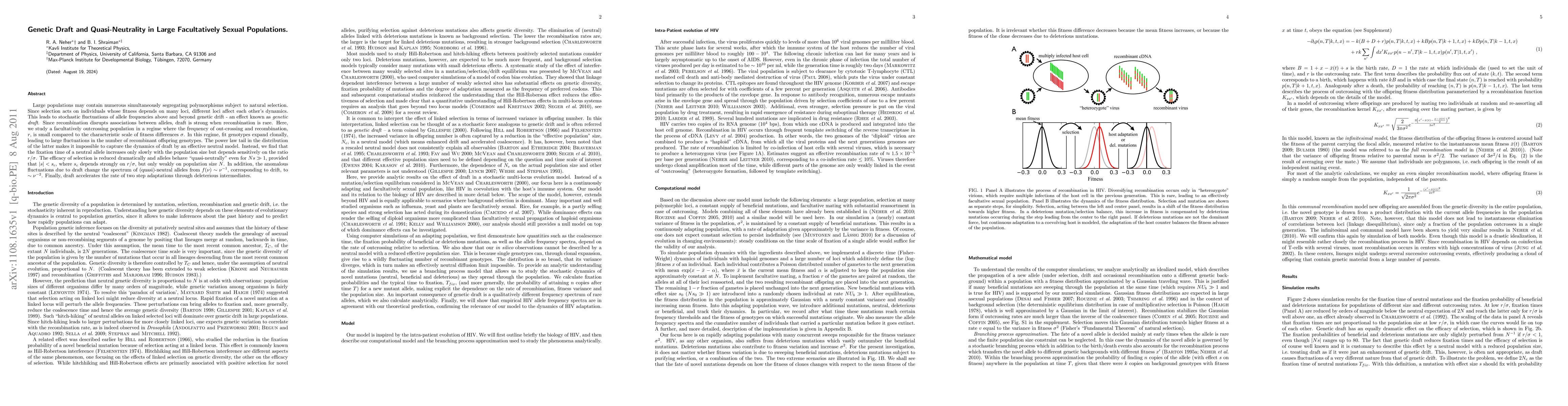 This paper investigates genetic draft in large facultatively sexual populations, showing that recombination's rarity leads to significant allele frequency fluctuations. It finds that alleles behave quasi-neutrally due to reduced selection efficacy, altering the spectrum of neutral alleles and accelerating two-step adaptations.