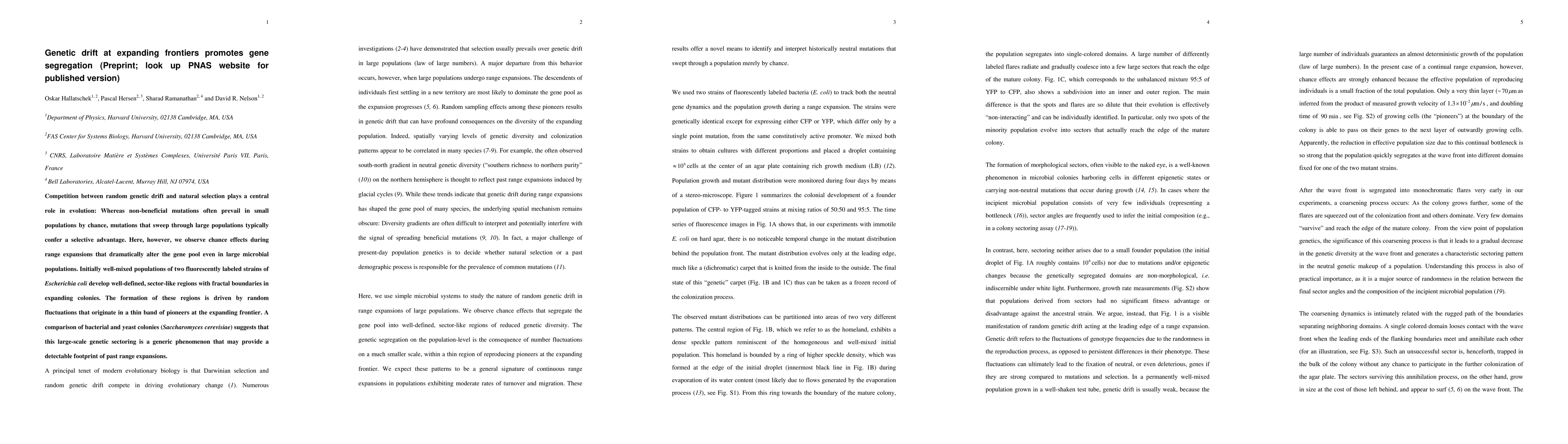 Competition between random genetic drift and natural selection plays a central role in evolution: Whereas non-beneficial mutations often prevail in small populations by chance, mutations that sweep through large populations typically confer a selective advantage. Here, however, we observe chance effects during range expansions that dramatically alter the gene pool even in large microbial populations. Initially well-mixed populations of two fluorescently labeled strains of Escherichia coli develop well-defined, sector-like regions with fractal boundaries in expanding colonies. The formation of these regions is driven by random fluctuations that originate in a thin band of pioneers at the expanding frontier. A comparison of bacterial and yeast colonies (Saccharomyces cerevisiae) suggests that this large-scale genetic sectoring is a generic phenomenon that may provide a detectable footprint of past range expansions.