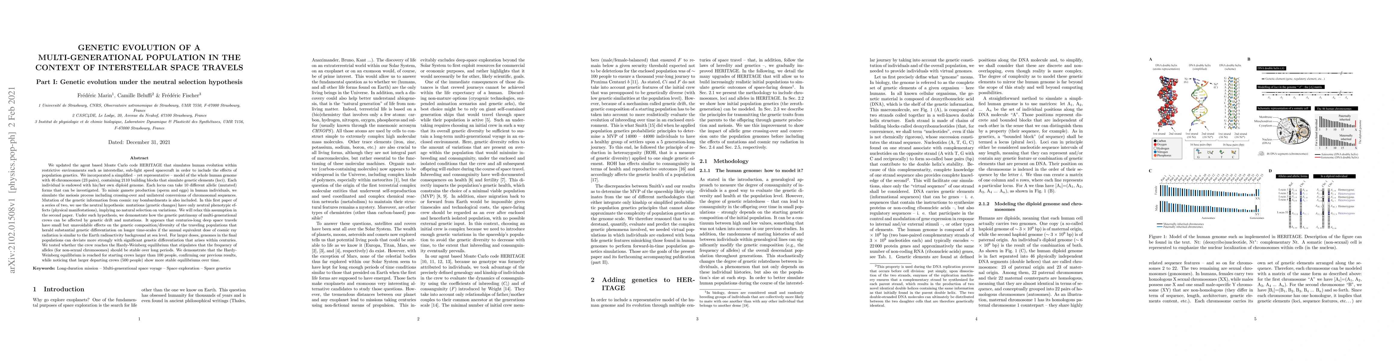 We updated the agent based Monte Carlo code HERITAGE that simulates human evolution within restrictive environments such as interstellar, sub-light speed spacecraft in order to include the effects of population genetics. We incorporated a simplified -- yet representative -- model of the whole human genome with 46 chromosomes (23 pairs), containing 2110 building blocks that simulate genetic elements (loci). Each individual is endowed with his/her own diploid genome. Each locus can take 10 different allelic (mutated) forms that can be investigated. To mimic gamete production (sperm and eggs) in human individuals, we simulate the meiosis process including crossing-over and unilateral conversions of chromosomal sequences. Mutation of the genetic information from cosmic ray bombardments is also included. In this first paper of a series of two, we use the neutral hypothesis: mutations (genetic changes) have only neutral phenotypic effects (physical manifestations), implying no natural selection on variations. We will relax this assumption in the second paper. Under such hypothesis, we demonstrate how the genetic patrimony of multi-generational crews can be affected by genetic drift and mutations. It appears that centuries-long deep space travels have small but unavoidable effects on the genetic composition/diversity of the traveling populations that herald substantial genetic differentiation on longer time-scales if the annual equivalent dose of cosmic ray radiation is similar to the Earth radioactivity background at sea level. For larger doses, genomes in the final populations can deviate more strongly with significant genetic differentiation that arises within centuries.