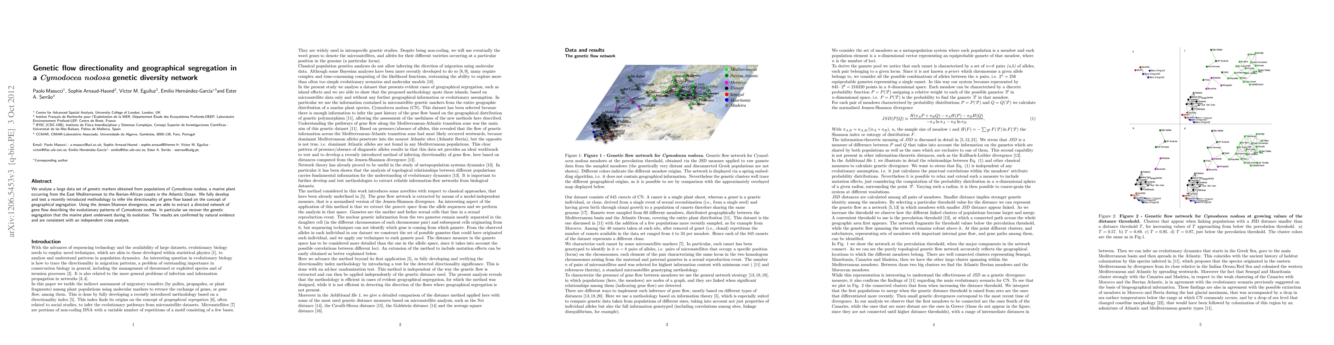 We analyse a large data set of genetic markers obtained from populations of Cymodocea nodosa, a marine plant occurring from the East Mediterranean to the Iberian-African coasts in the Atlantic Ocean. We fully develop and test a recently introduced methodology to infer the directionality of gene flow based on the concept of geographical segregation. Using the Jensen-Shannon divergence, we are able to extract a directed network of gene flow describing the evolutionary patterns of Cymodocea nodosa. In particular we recover the genetic segregation that the marine plant underwent during its evolution. The results are confirmed by natural evidence and are consistent with an independent cross analysis.