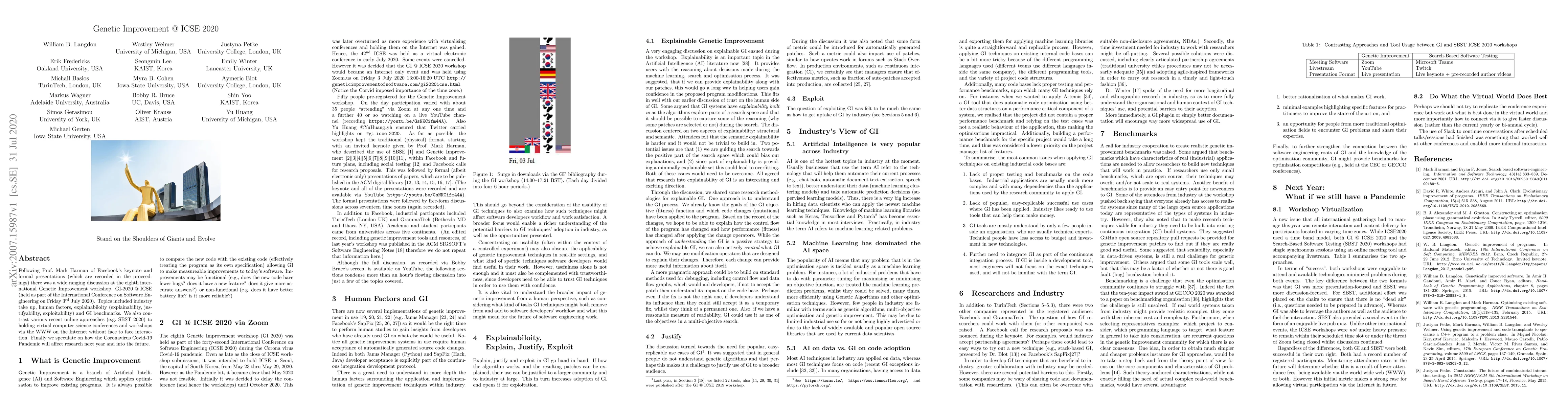 Following Prof. Mark Harman of Facebook's keynote and formal presentations (which are recorded in the proceedings) there was a wide ranging discussion at the eighth international Genetic Improvement workshop, GI-2020 @ ICSE (held as part of the 42nd ACM/IEEE International Conference on Software Engineering on Friday 3rd July 2020). Topics included industry take up, human factors, explainabiloity (explainability, justifyability, exploitability) and GI benchmarks. We also contrast various recent online approaches (e.g. SBST 2020) to holding virtual computer science conferences and workshops via the WWW on the Internet without face-2-face interaction. Finally we speculate on how the Coronavirus Covid-19 Pandemic will affect research next year and into the future.