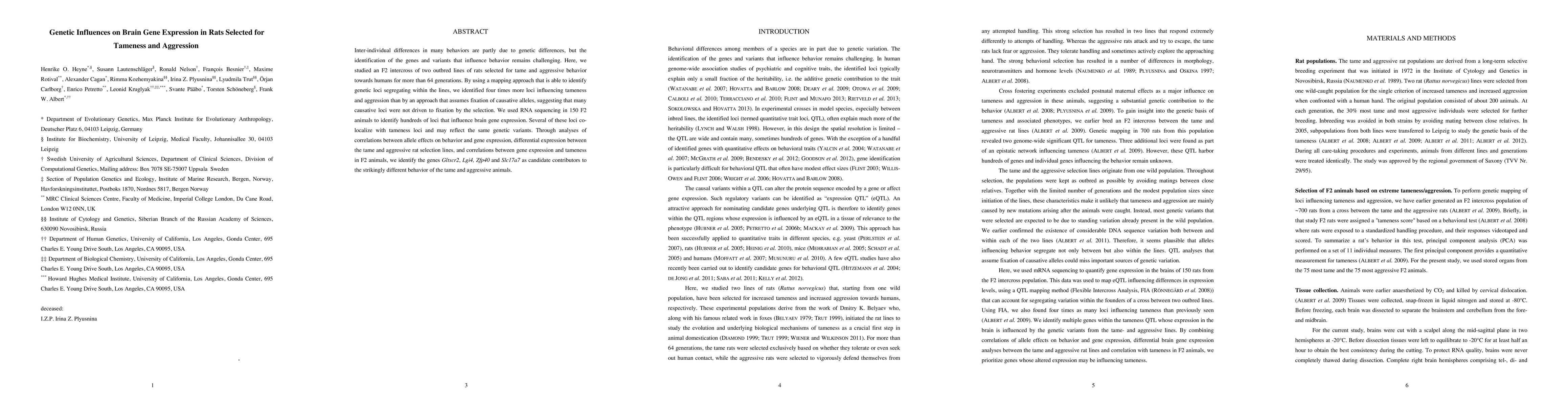 Inter-individual differences in many behaviors are partly due to genetic differences, but the identification of the genes and variants that influence behavior remains challenging. Here, we studied an F2 intercross of two outbred lines of rats selected for tame and aggressive behavior towards humans for more than 64 generations. By using a mapping approach that is able to identify genetic loci segregating within the lines, we identified four times more loci influencing tameness and aggression than by an approach that assumes fixation of causative alleles, suggesting that many causative loci were not driven to fixation by the selection. We used RNA sequencing in 150 F2 animals to identify hundreds of loci that influence brain gene expression. Several of these loci colocalize with tameness loci and may reflect the same genetic variants. Through analyses of correlations between allele effects on behavior and gene expression, differential expression between the tame and aggressive rat selection lines, and correlations between gene expression and tameness in F2 animals, we identify the genes Gltscr2, Lgi4, Zfp40 and Slc17a7 as candidate contributors to the strikingly different behavior of the tame and aggressive animals.