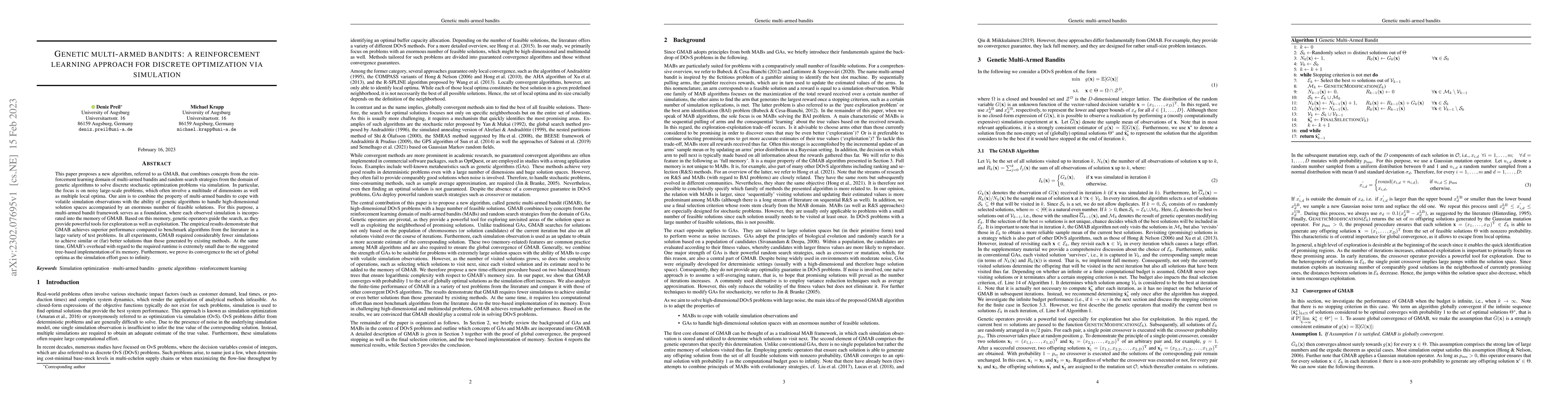 This paper introduces GMAB, a hybrid reinforcement learning algorithm combining multi-armed bandit strategies and genetic algorithms to tackle large-scale, noisy discrete optimization problems. GMAB leverages the memory of simulation observations and genetic operators for efficient exploration and exploitation, demonstrating superior performance with fewer simulations and minimal runtime overhead.