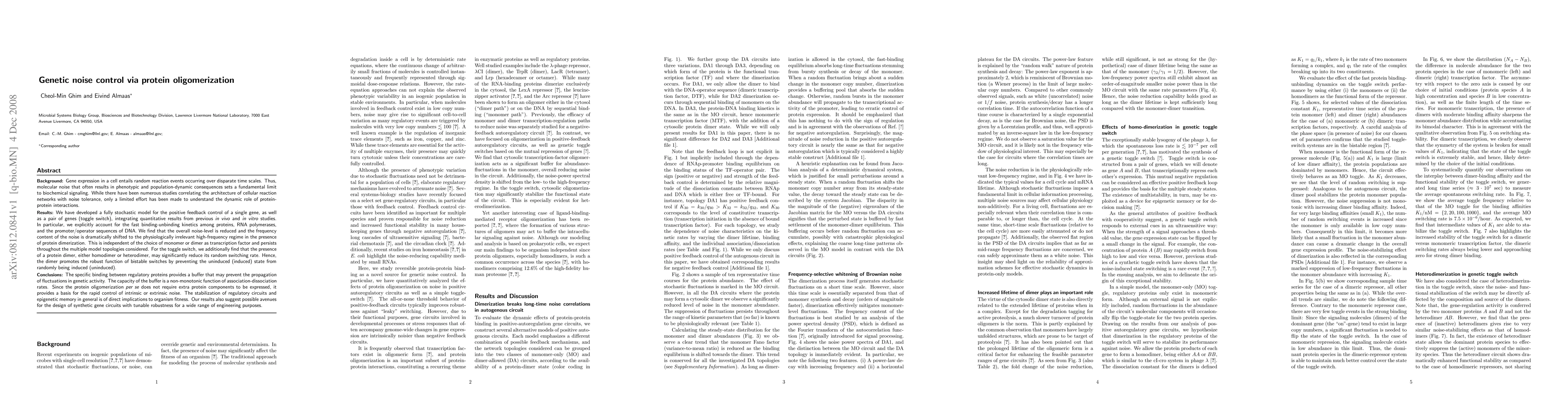 Gene expression in a cell entails random reaction events occurring over disparate time scales. Thus, molecular noise that often results in phenotypic and population-dynamic consequences sets a fundamental limit to biochemical signaling. While there have been numerous studies correlating the architecture of cellular reaction networks with noise tolerance, only a limited effort has been made to understand the dynamic role of protein-protein interactions. Here we have developed a fully stochastic model for the positive feedback control of a single gene, as well as a pair of genes (toggle switch), integrating quantitative results from previous in vivo and in vitro studies. We find that the overall noise-level is reduced and the frequency content of the noise is dramatically shifted to the physiologically irrelevant high-frequency regime in the presence of protein dimerization. This is independent of the choice of monomer or dimer as transcription factor and persists throughout the multiple model topologies considered. For the toggle switch, we additionally find that the presence of a protein dimer, either homodimer or heterodimer, may significantly reduce its random switching rate. Hence, the dimer promotes the robust function of bistable switches by preventing the uninduced (induced) state from randomly being induced (uninduced). The specific binding between regulatory proteins provides a buffer that may prevent the propagation of fluctuations in genetic activity. The capacity of the buffer is a non-monotonic function of association-dissociation rates. Since the protein oligomerization per se does not require extra protein components to be expressed, it provides a basis for the rapid control of intrinsic or extrinsic noise.