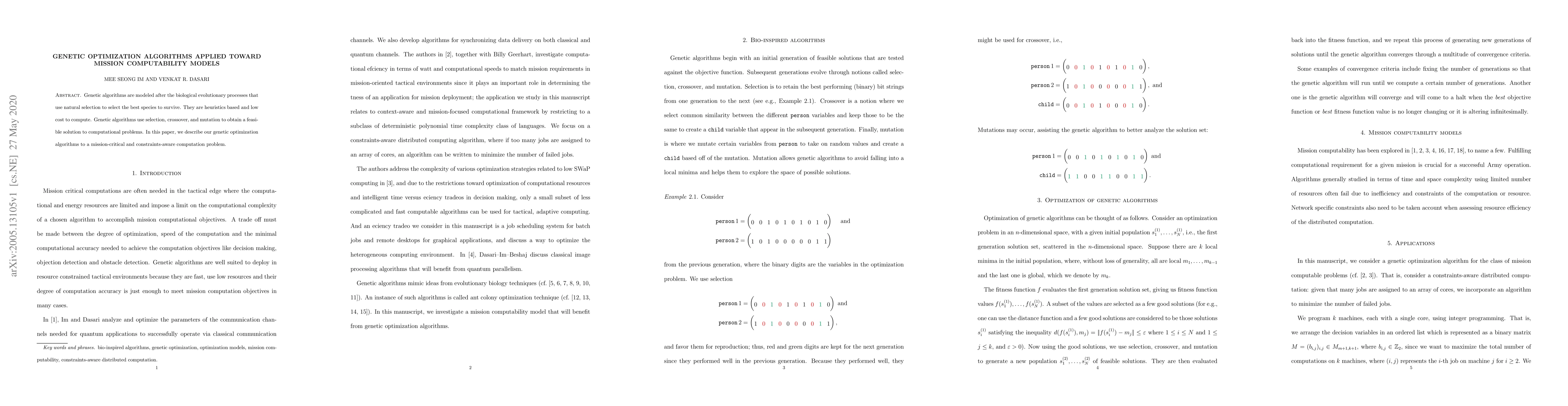 This paper explores the use of genetic optimization algorithms, inspired by natural selection processes, to solve computational problems with mission-critical constraints. The study focuses on the application of genetic algorithms' selection, crossover, and mutation techniques to achieve feasible solutions.