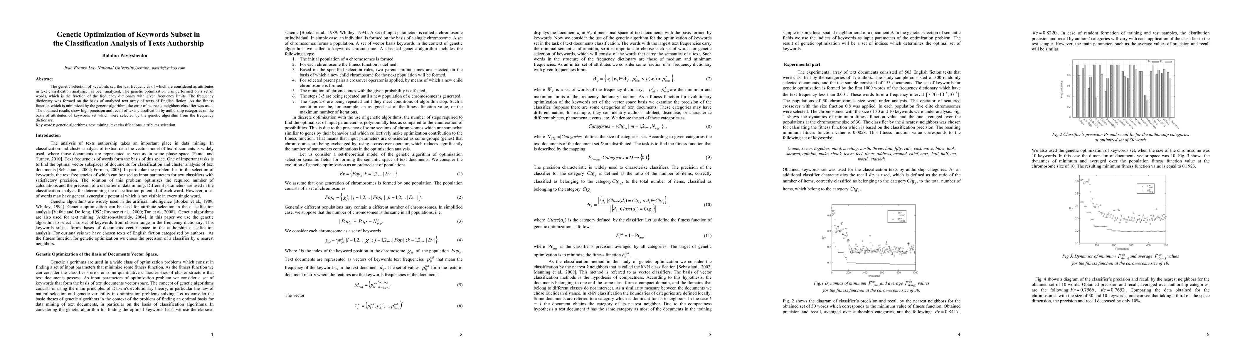 This paper explores the genetic optimization of a keyword subset for text classification analysis of authorship, achieving high precision and recall by minimizing the error of a nearest k neighbors classifier. The genetic algorithm selects keywords from a frequency dictionary derived from a corpus of English fiction texts.