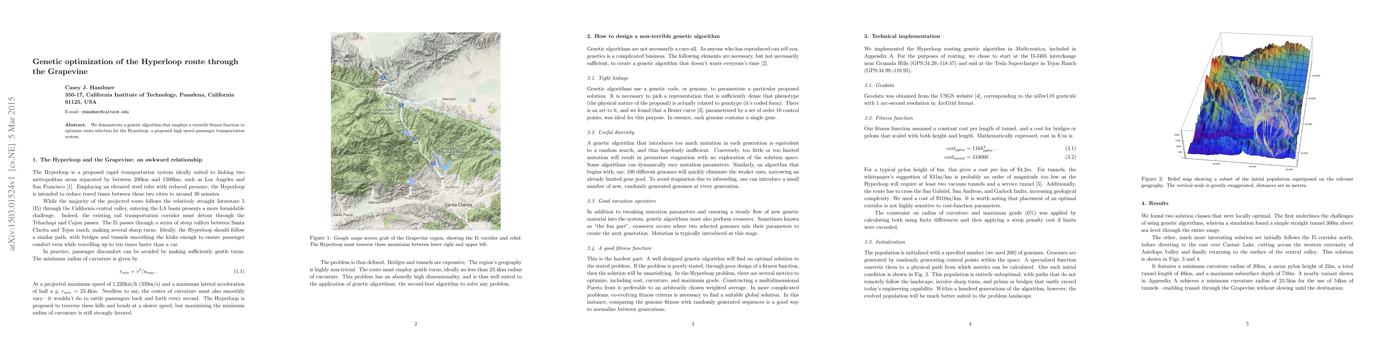 We demonstrate a genetic algorithm that employs a versatile fitness function to optimize route selection for the Hyperloop, a proposed high speed passenger transportation system.