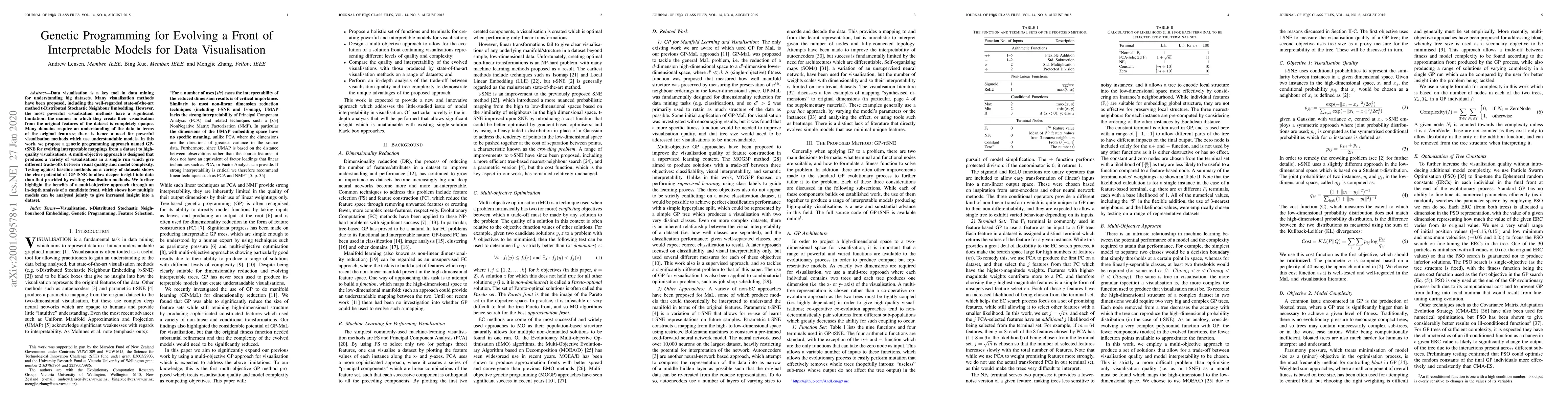 Data visualisation is a key tool in data mining for understanding big datasets. Many visualisation methods have been proposed, including the well-regarded state-of-the-art method t-Distributed Stochastic Neighbour Embedding. However, the most powerful visualisation methods have a significant limitation: the manner in which they create their visualisation from the original features of the dataset is completely opaque. Many domains require an understanding of the data in terms of the original features; there is hence a need for powerful visualisation methods which use understandable models. In this work, we propose a genetic programming approach named GPtSNE for evolving interpretable mappings from a dataset to highquality visualisations. A multi-objective approach is designed that produces a variety of visualisations in a single run which give different trade-offs between visual quality and model complexity. Testing against baseline methods on a variety of datasets shows the clear potential of GP-tSNE to allow deeper insight into data than that provided by existing visualisation methods. We further highlight the benefits of a multi-objective approach through an in-depth analysis of a candidate front, which shows how multiple models can