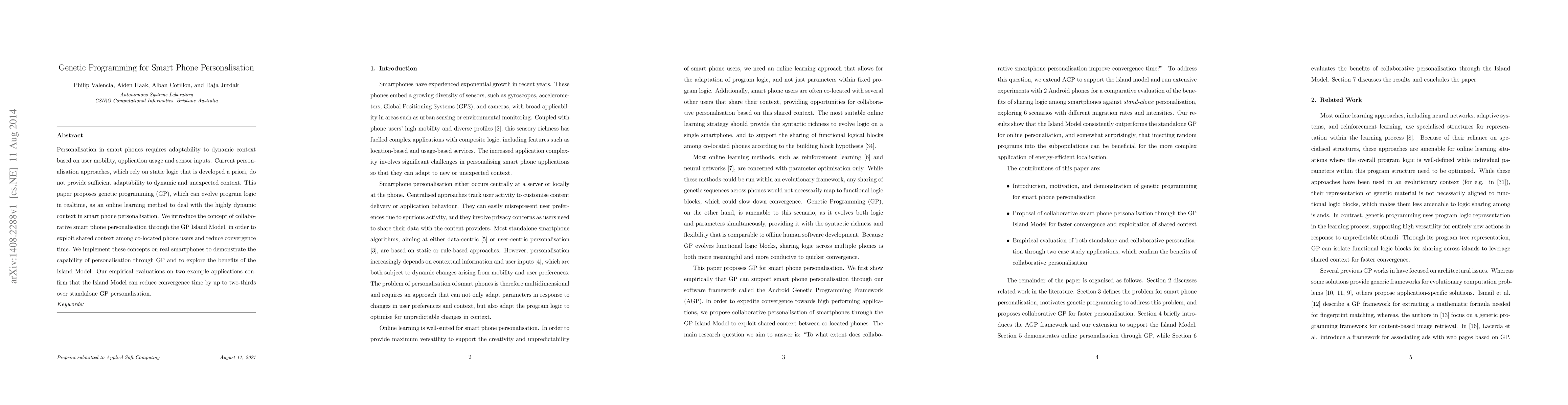 This paper proposes genetic programming as an adaptive online learning method for smartphone personalization, addressing dynamic contexts through real-time evolution of program logic. The GP Island Model leverages shared context among co-located users to enhance personalization efficiency, reducing convergence time by up to two-thirds compared to standalone GP personalization.