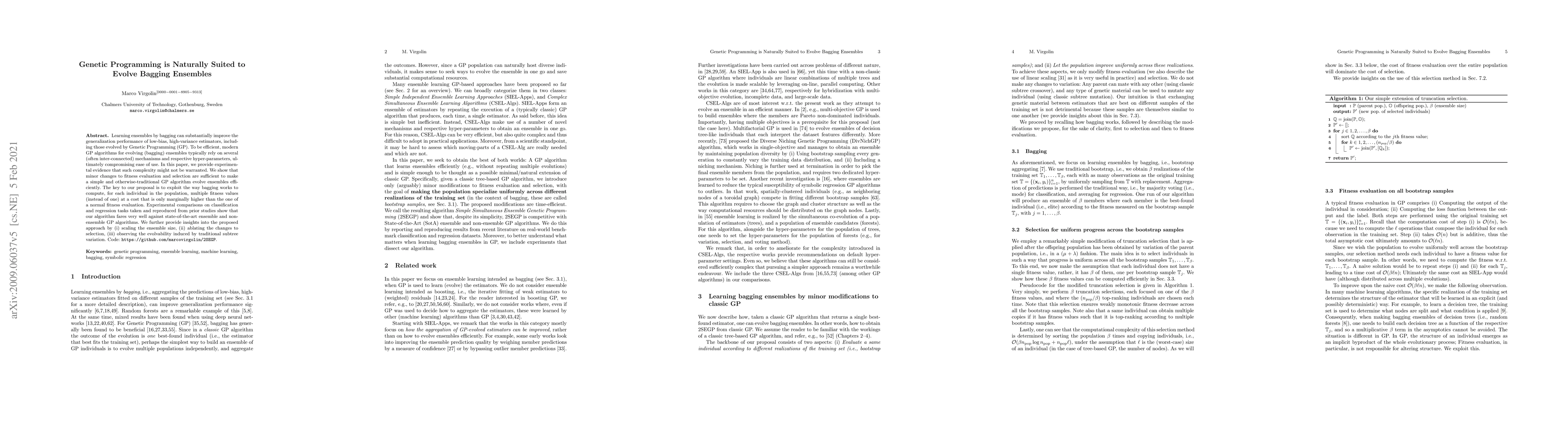 Learning ensembles by bagging can substantially improve the generalization performance of low-bias, high-variance estimators, including those evolved by Genetic Programming (GP). To be efficient, modern GP algorithms for evolving (bagging) ensembles typically rely on several (often inter-connected) mechanisms and respective hyper-parameters, ultimately compromising ease of use. In this paper, we provide experimental evidence that such complexity might not be warranted. We show that minor changes to fitness evaluation and selection are sufficient to make a simple and otherwise-traditional GP algorithm evolve ensembles efficiently. The key to our proposal is to exploit the way bagging works to compute, for each individual in the population, multiple fitness values (instead of one) at a cost that is only marginally higher than the one of a normal fitness evaluation. Experimental comparisons on classification and regression tasks taken and reproduced from prior studies show that our algorithm fares very well against state-of-the-art ensemble and non-ensemble GP algorithms. We further provide insights into the proposed approach by (i) scaling the ensemble size, (ii) ablating the changes to selection, (iii) observing the evolvability induced by traditional subtree variation. Code: https://github.com/marcovirgolin/2SEGP.