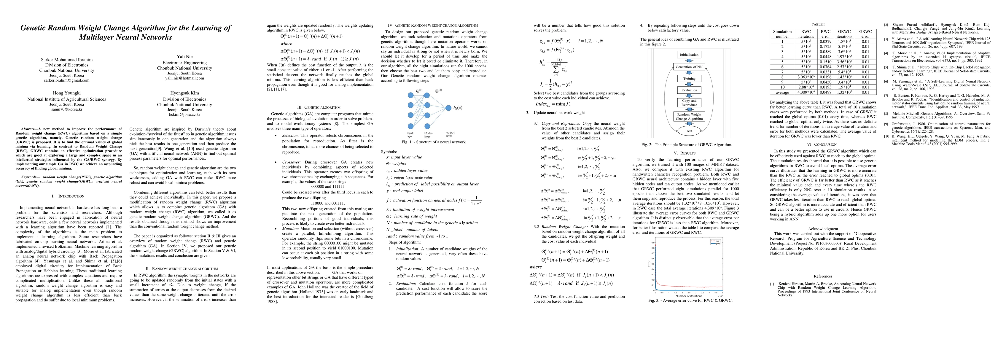 Summary: The paper proposes a Genetic Random Weight Change (GRWC) algorithm that enhances the Random Weight Change (RWC) method using a genetic algorithm to optimize neural network training, achieving superior accuracy in finding global minima. The synergy of genetic algorithms and RWC enables exploration of complex learning spaces.