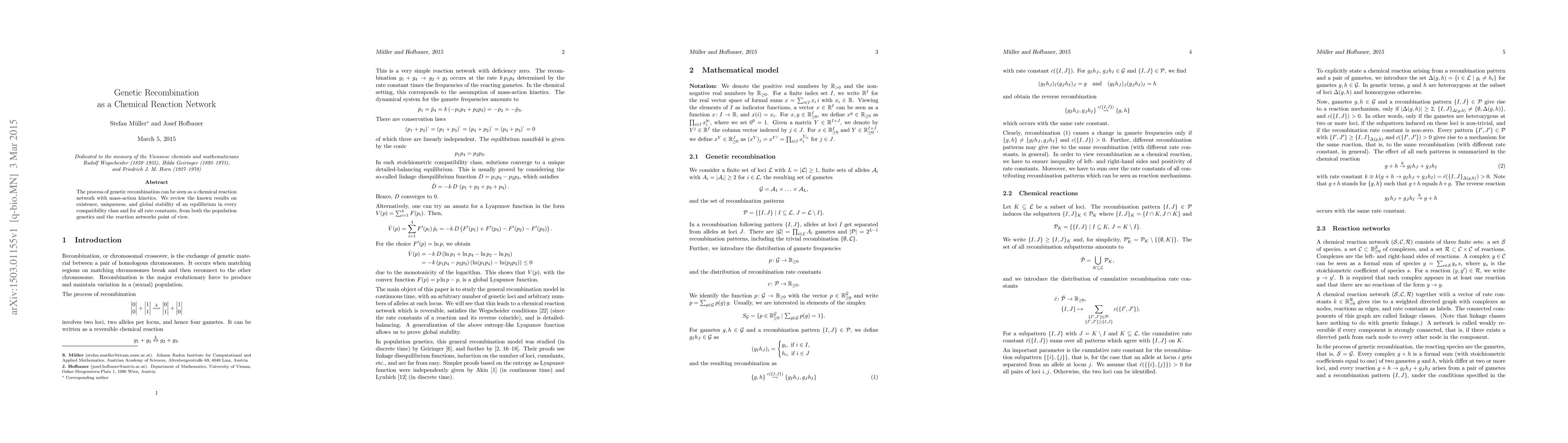 This paper explores genetic recombination through the lens of chemical reaction networks, reviewing the existence, uniqueness, and global stability of equilibria under mass-action kinetics, integrating insights from both population genetics and reaction network theory.