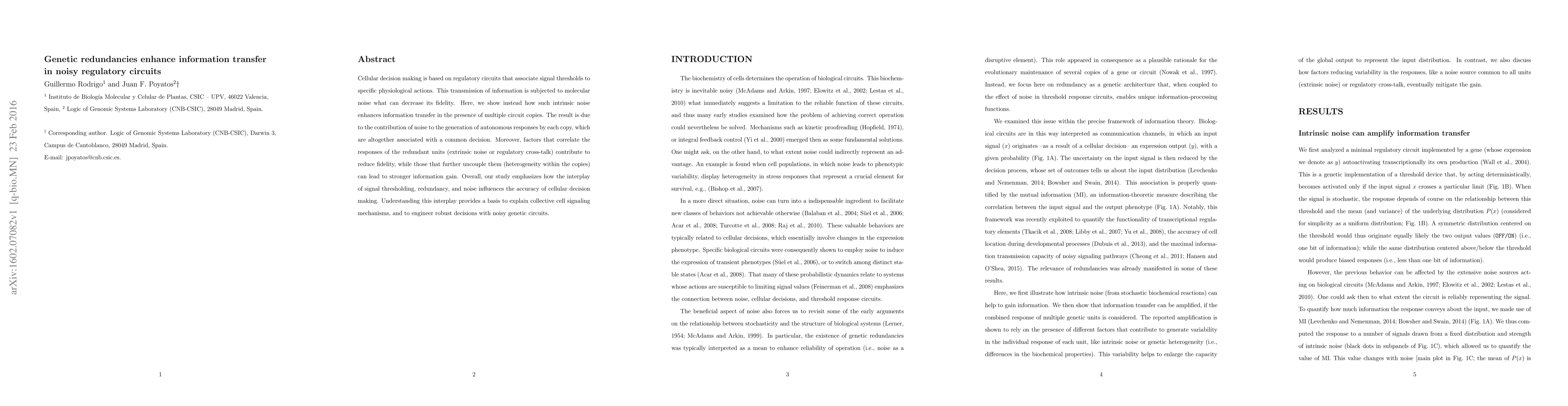 This paper demonstrates that genetic redundancies in regulatory circuits enhance information transfer despite molecular noise, which typically decreases fidelity. The intrinsic noise aids in generating autonomous responses in multiple circuit copies, collectively contributing to a common decision, thereby improving information transfer.