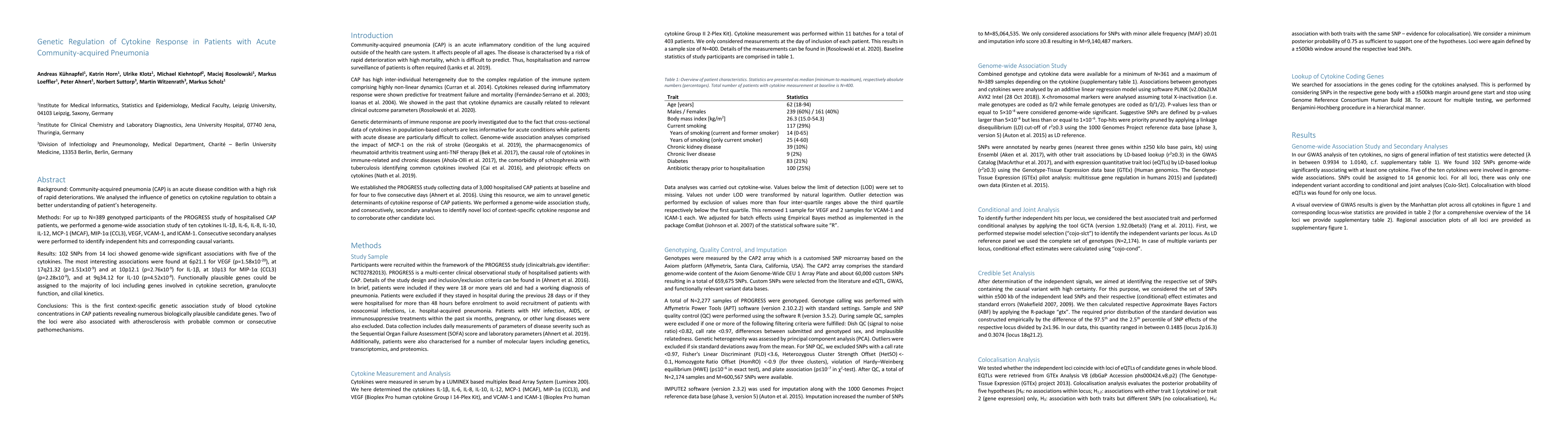 This study identifies genetic loci associated with cytokine regulation in patients with acute community-acquired pneumonia, revealing several biologically plausible candidate genes involved in cytokine secretion and granulocyte function. Notably, two loci were linked to both pneumonia and atherosclerosis, suggesting shared pathomechanisms.