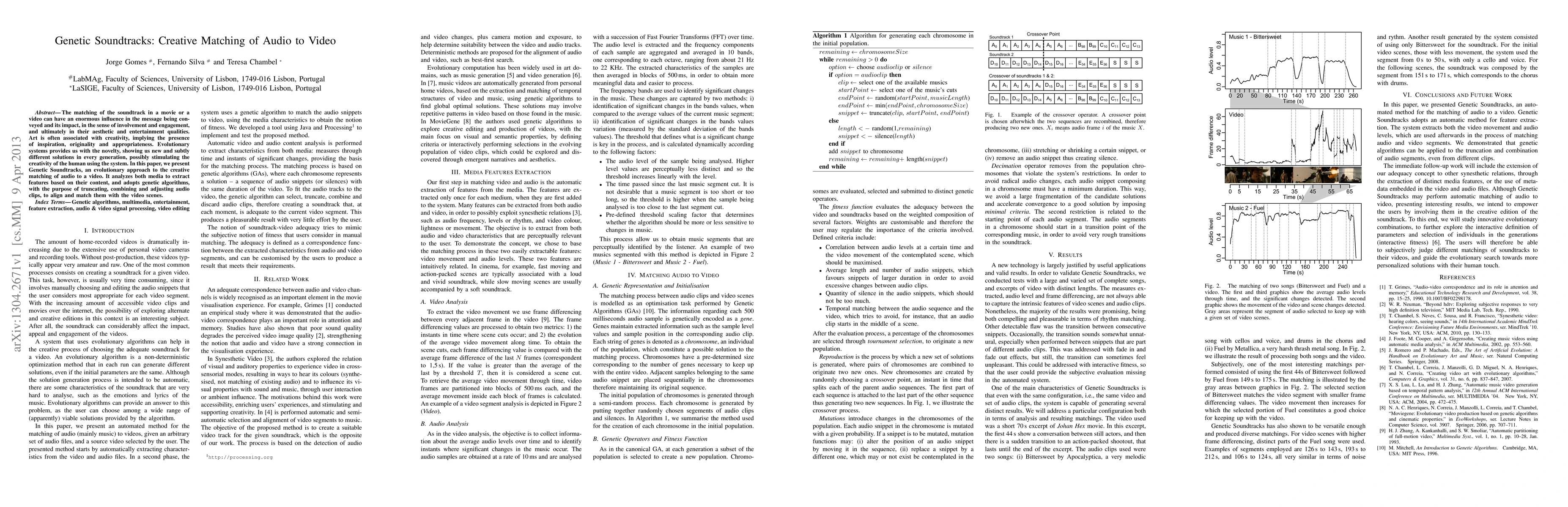 This paper introduces Genetic Soundtracks, an evolutionary method for creatively matching audio to video by analyzing the content of both media to extract features, and using genetic algorithms to truncate, combine, and adjust audio clips to align with video scenes. The aim is to enhance the message, engagement, and aesthetic qualities of the video.