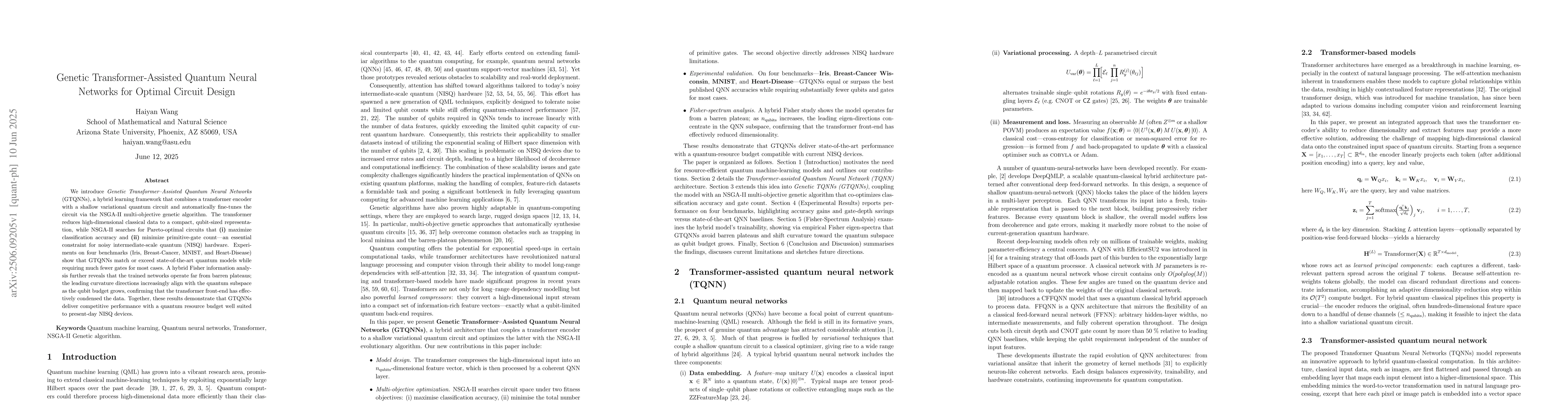 We introduce Genetic Transformer Assisted Quantum Neural Networks (GTQNNs), a hybrid learning framework that combines a transformer encoder with a shallow variational quantum circuit and automatically fine tunes the circuit via the NSGA-II multi objective genetic algorithm. The transformer reduces high-dimensional classical data to a compact, qubit sized representation, while NSGA-II searches for Pareto optimal circuits that (i) maximize classification accuracy and (ii) minimize primitive gate count an essential constraint for noisy intermediate-scale quantum (NISQ) hardware. Experiments on four benchmarks (Iris, Breast Cancer, MNIST, and Heart Disease) show that GTQNNs match or exceed state of the art quantum models while requiring much fewer gates for most cases. A hybrid Fisher information analysis further reveals that the trained networks operate far from barren plateaus; the leading curvature directions increasingly align with the quantum subspace as the qubit budget grows, confirming that the transformer front end has effectively condensed the data. Together, these results demonstrate that GTQNNs deliver competitive performance with a quantum resource budget well suited to present-day NISQ devices.