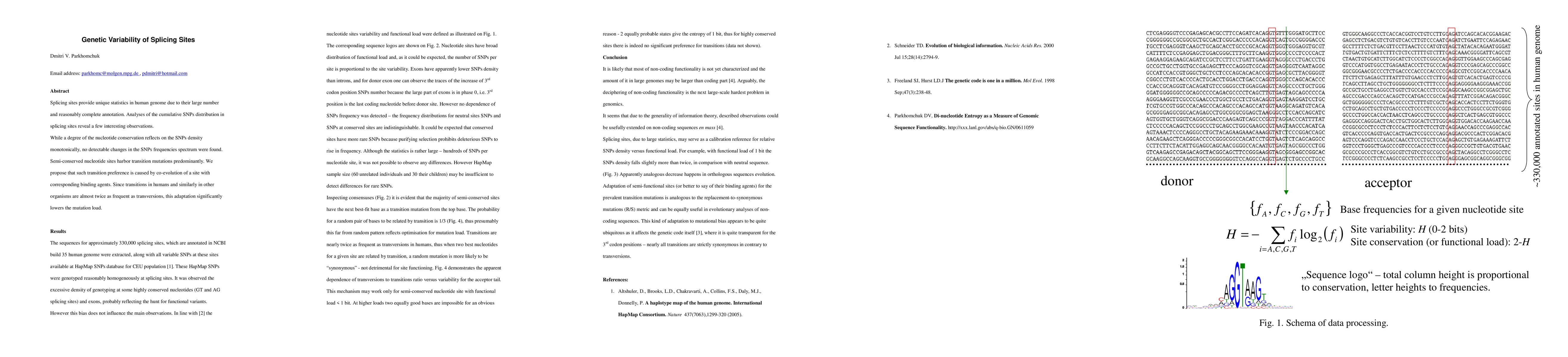 Splicing sites provide unique statistics in human genome due to their large number and reasonably complete annotation. Analyses of the cumulative SNPs distribution in splicing sites reveal a few interesting observations. While a degree of the nucleotide conservation reflects on the SNPs density monotonically, no detectable changes in the SNPs frequencies spectrum were found. Semi-conserved nucleotide sites harbor transition mutations predominantly. We propose that such transition preference is caused by co-evolution of a site with corresponding binding agents. Since transitions in humans and similarly in other organisms are almost twice as frequent as transversions, this adaptation significantly lowers the mutation load.