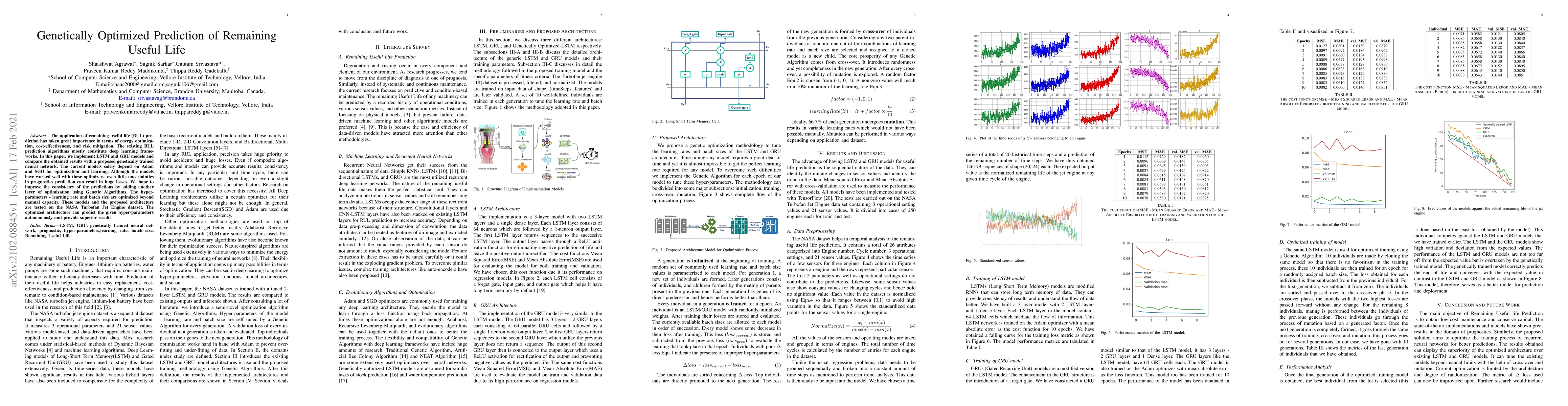 The application of remaining useful life (RUL) prediction has taken great importance in terms of energy optimization, cost-effectiveness, and risk mitigation. The existing RUL prediction algorithms mostly constitute deep learning frameworks. In this paper, we implement LSTM and GRU models and compare the obtained results with a proposed genetically trained neural network. The current models solely depend on Adam and SGD for optimization and learning. Although the models have worked well with these optimizers, even little uncertainties in prognostics prediction can result in huge losses. We hope to improve the consistency of the predictions by adding another layer of optimization using Genetic Algorithms. The hyper-parameters - learning rate and batch size are optimized beyond manual capacity. These models and the proposed architecture are tested on the NASA Turbofan Jet Engine dataset. The optimized architecture can predict the given hyper-parameters autonomously and provide superior results.