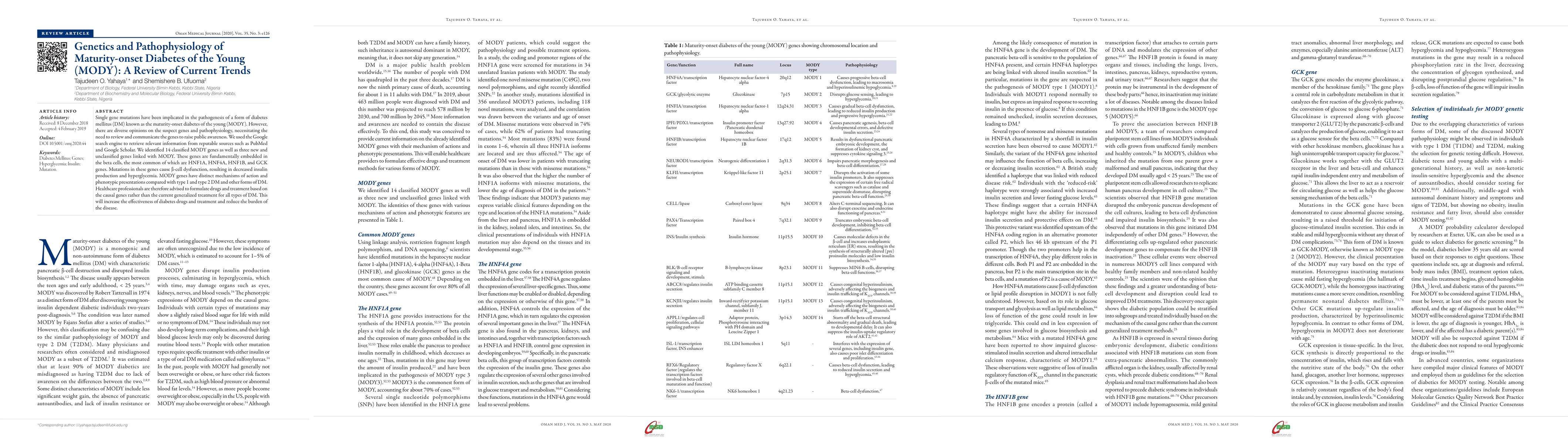 Single gene mutations have been implicated in the pathogenesis of a form of diabetes mellitus (DM) known as the maturity-onset diabetes of the young (MODY). However, there are diverse opinions on the suspect genes and pathophysiology, necessitating the need to review and communicate the genes to raise public awareness. We used the Google search engine to retrieve relevant information from reputable sources such as PubMed and Google Scholar. We identified 14 classified MODY genes as well as three new and unclassified genes linked with MODY. These genes are fundamentally embedded in the beta cells, the most common of which are HNF1A, HNF4A, HNF1B, and GCK genes. Mutations in these genes cause beta-cell dysfunction, resulting in decreased insulin production and hyperglycemia. MODY genes have distinct mechanisms of action and phenotypic presentations compared with type 1 and type 2 DM and other forms of DM. Healthcare professionals are therefore advised to formulate drugs and treatment based on the causal genes rather than the current generalized treatment for all types of DM. This will increase the effectiveness of diabetes drugs and treatment and reduce the burden of the disease.