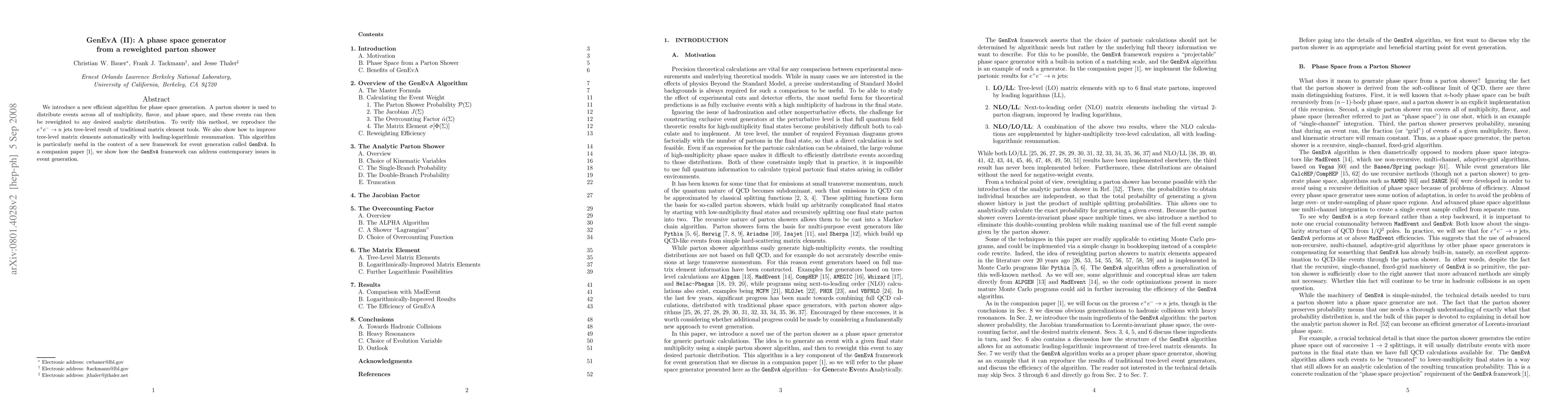We introduce a new efficient algorithm for phase space generation. A parton shower is used to distribute events across all of multiplicity, flavor, and phase space, and these events can then be reweighted to any desired analytic distribution. To verify this method, we reproduce the e+e- -> n jets tree-level result of traditional matrix element tools. We also show how to improve tree-level matrix elements automatically with leading-logarithmic resummation. This algorithm is particularly useful in the context of a new framework for event generation called GenEvA. In a companion paper [arXiv:0801.4026], we show how the GenEvA framework can address contemporary issues in event generation.
