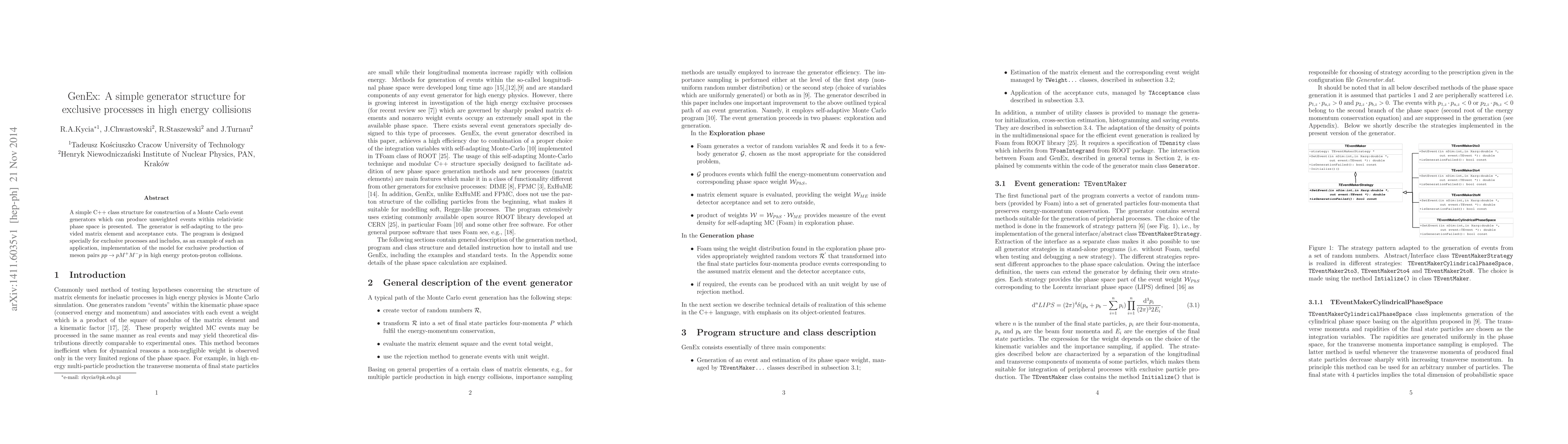 A simple C++ class structure for construction of a Monte Carlo event generators which can produce unweighted events within relativistic phase space is presented. The generator is self-adapting to the provided matrix element and acceptance cuts. The program is designed specially for exclusive processes and includes, as an example of such an application, implementation of the model for exclusive production of meson pairs $pp \rightarrow p M^+M^- p $ in high energy proton-proton collisions.
