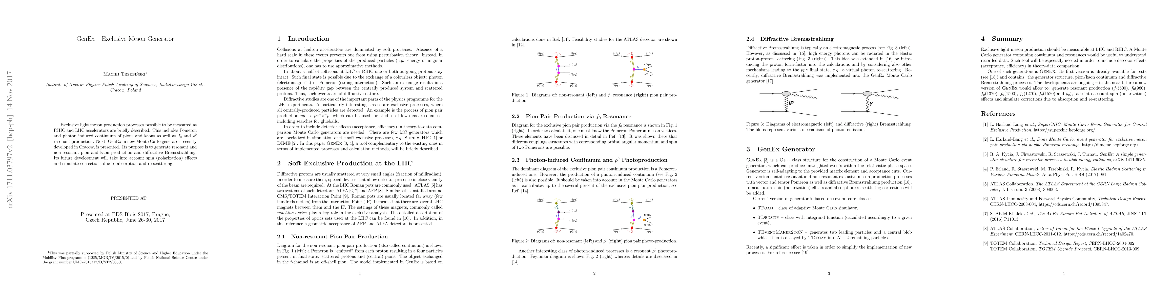 Exclusive light meson production processes possible to be measured at RHIC and LHC accelerators are briefly described. This includes Pomeron and photon induced continuum of pions and kaons as well as $f_0$ and $\rho^0$ resonant production. Next, GenEx, a new Monte Carlo generator recently developed in Cracow, is presented. Its purpose is to generate resonant and non-resonant pion and kaon production and diffractive Bremsstrahlung. Its future development will take into account spin (polarization) effects and simulate corrections due to absorption and re-scattering.