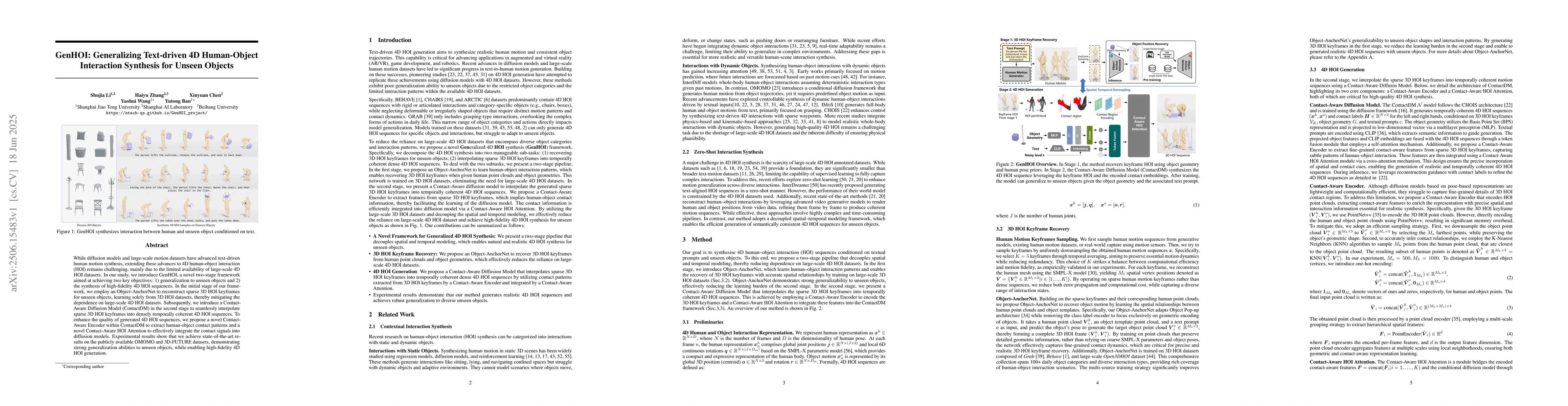 While diffusion models and large-scale motion datasets have advanced text-driven human motion synthesis, extending these advances to 4D human-object interaction (HOI) remains challenging, mainly due to the limited availability of large-scale 4D HOI datasets. In our study, we introduce GenHOI, a novel two-stage framework aimed at achieving two key objectives: 1) generalization to unseen objects and 2) the synthesis of high-fidelity 4D HOI sequences. In the initial stage of our framework, we employ an Object-AnchorNet to reconstruct sparse 3D HOI keyframes for unseen objects, learning solely from 3D HOI datasets, thereby mitigating the dependence on large-scale 4D HOI datasets. Subsequently, we introduce a Contact-Aware Diffusion Model (ContactDM) in the second stage to seamlessly interpolate sparse 3D HOI keyframes into densely temporally coherent 4D HOI sequences. To enhance the quality of generated 4D HOI sequences, we propose a novel Contact-Aware Encoder within ContactDM to extract human-object contact patterns and a novel Contact-Aware HOI Attention to effectively integrate the contact signals into diffusion models. Experimental results show that we achieve state-of-the-art results on the publicly available OMOMO and 3D-FUTURE datasets, demonstrating strong generalization abilities to unseen objects, while enabling high-fidelity 4D HOI generation.