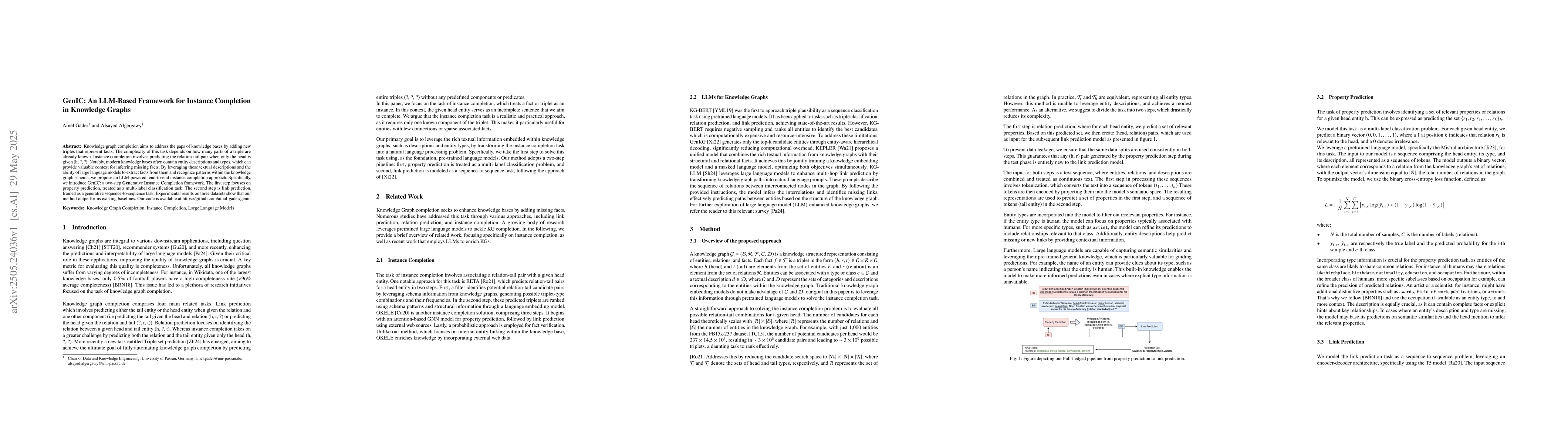 The paper proposes GenIC, a two-step Generative Instance Completion framework for knowledge graphs, leveraging large language models (LLMs). The first step involves property prediction as a multi-label classification task, and the second step is link prediction as a generative sequence-to-sequence task.